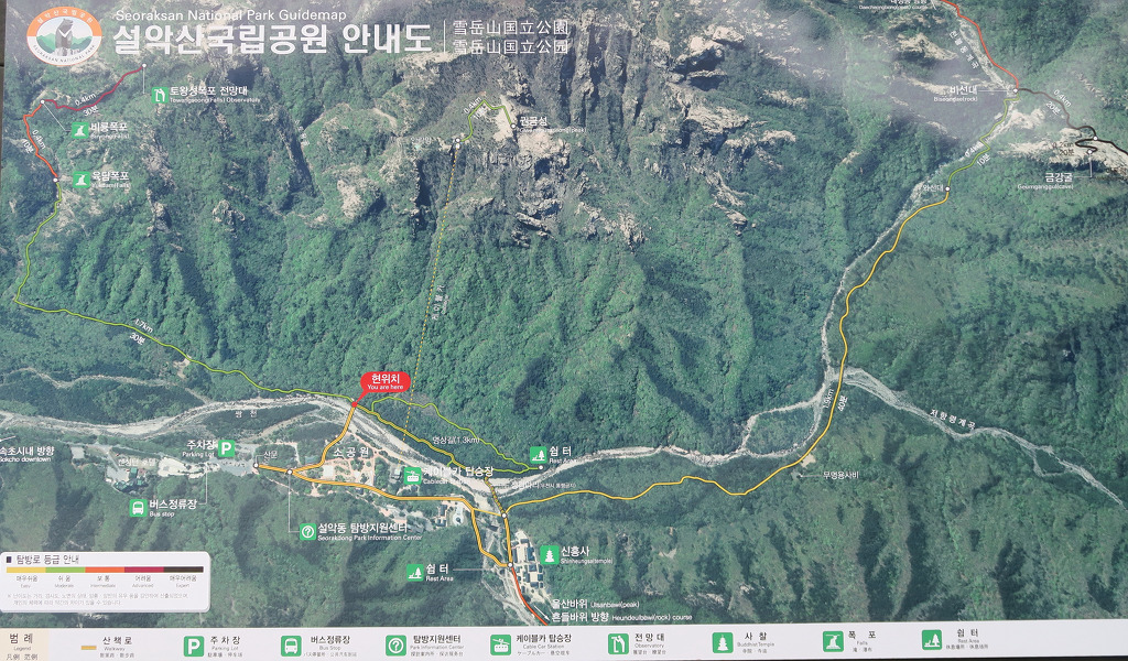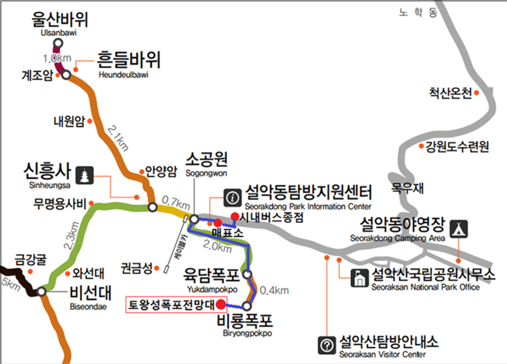 산행코스 : 1) 설악동 매표소-소공원-케이블카 매표소 및 탑승장-신흥사-하산식당 예약 확인 (약 2km, 1시간)