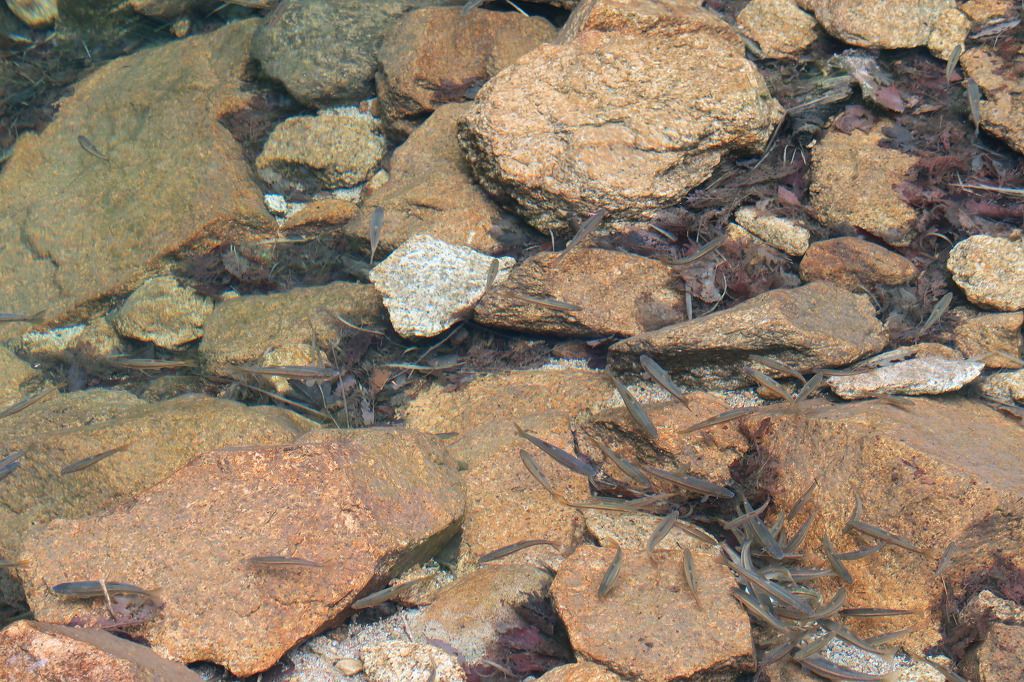 맑은 비룡폭포의 물 속에서 헤엄치는 물고기.