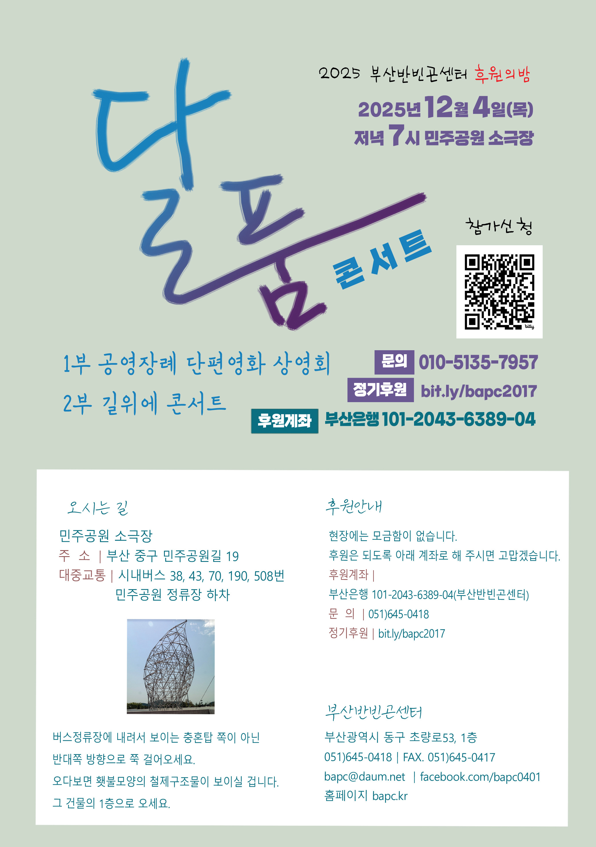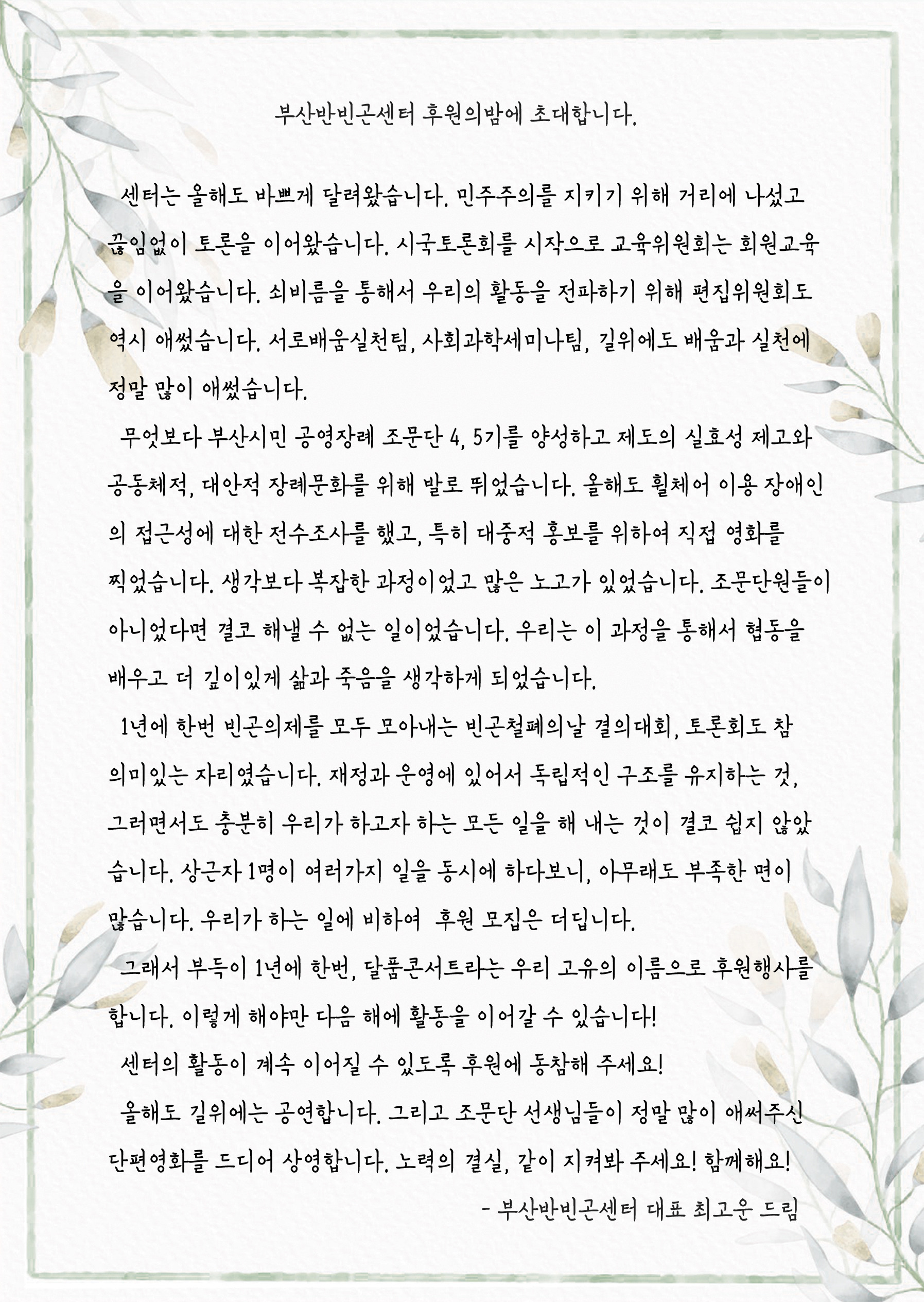 1년에 한번 빈곤의제를 모두 모아내는 빈곤철폐의날 결의대회, 토론회도 참 의미있는 자리였습니다. 재정과 운영에 있어서 독립적인 구조를 유지하는 것, 그러면서도 충분히 우리가 하고자 하는 모든 일을 해 내는 것이 결코 쉽지 않았습니다. 상근자 1명이 여러가지 일을 동시에 하다보니, 아무래도 부족한 면이 많습니다. 우리가 하는 일에 비하여 후원 모집은 더딥니다. 그래서 부득이 1년에 한번, 달품콘서트라는 우리 고유의 이름으로 후원행사를 합니다. 이렇게 해야만 다음 해에 활동을 이어갈 수 있습니다!