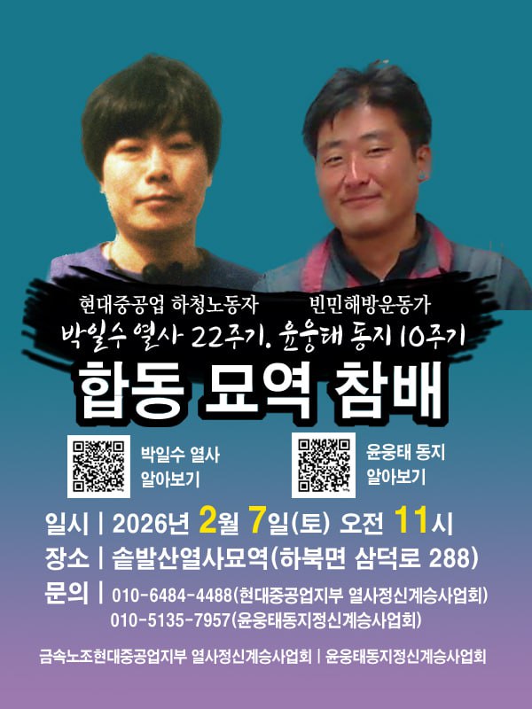 올해는 특별히 10주기를 맞아, 토론회도 개최하고자 합니다. 윤웅태 동지의 운동과 실천을 살펴보고 또 우리가 나아갈 방향과 대안을 모색해 보는 시간이 될 것입니다. 추모제, 토론회 가능한 일정에 함께해 주세요! 추모제는 차량동승이 가능하니 차편이 필요하신 분은 저에게 연락 주시면 됩니다.