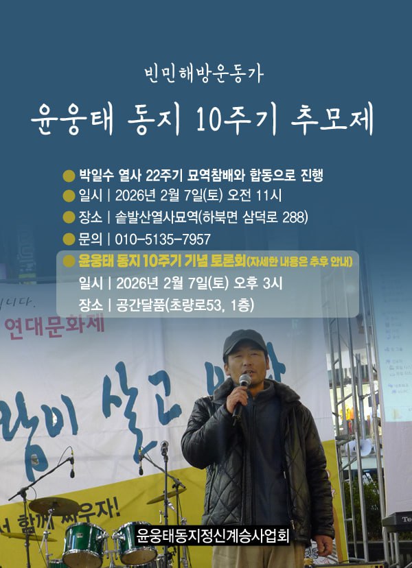 윤웅태 동지 10주기 추모제 일정이 확정됐습니다! 미리미리 일정 빼놓고 시간내어 함께해 주시면 감사하겠습니다.