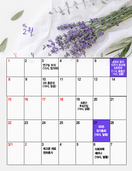 2026년 2월 일정표 작성자부산반빈곤센터|작성시간26.01.26|조회수21 목록 댓글 0 글자크기 작게가 글자크기 크게가 다음검색 현재 게시글 추가 기능 열기 북마크 신고 센터로 신고 댓글 댓글 0 댓글쓰기 답글쓰기 댓글 리스트