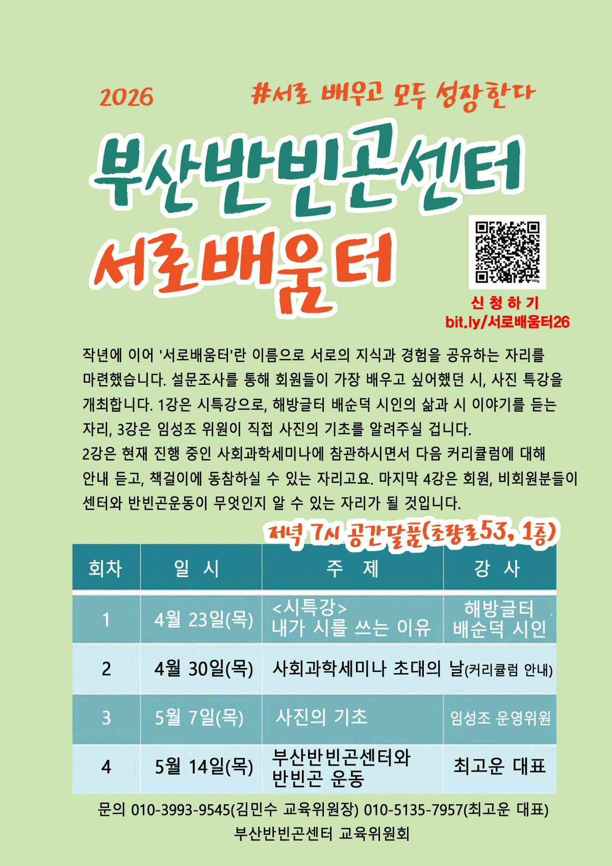 작년에 이어 '서로배움터'란 이름으로 서로의 지식과 경험을 공유하는 자리를 마련했습니다. 설문조사를 통해 회원들이 가장 배우고 싶어했던 시, 사진 특강을 개최합니다. 1강은 시특강으로, 해방글터 배순덕 시인의 삶과 시 이야기를 듣는 자리, 3강은 임성조 위원이 직접 사진의 기초를 알려주실 겁니다.