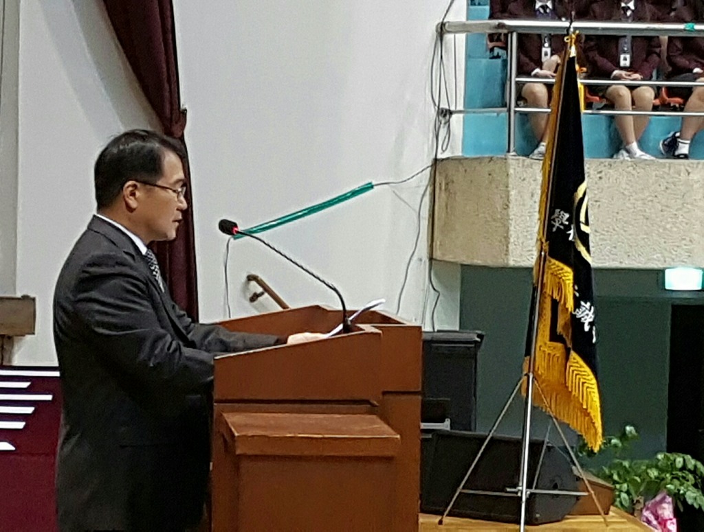 문일여고 홍성조 교장이 입학식에서 인사말을 전하고 있다 .