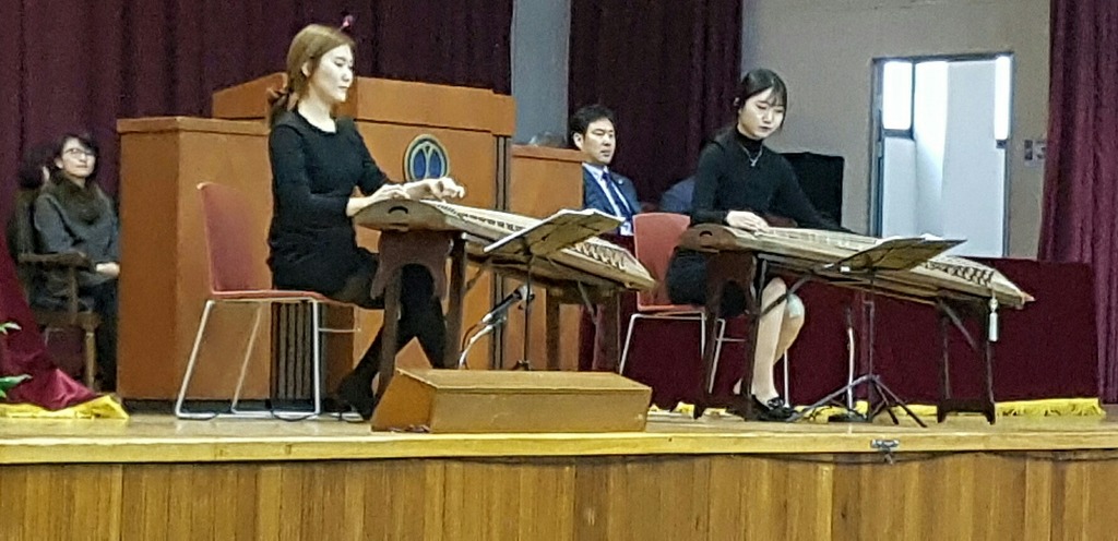 금융고 교사들이 입학 축하 가야금 연주를 하고 있다.