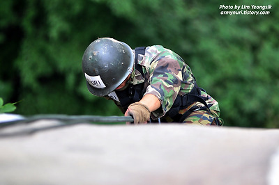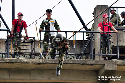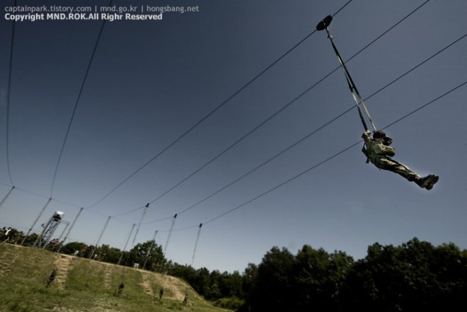 기자의 경험에 의하면 유격훈련 중 가장 어려운 것이 바로 이 외줄타기가 아닌가 싶은데요~ 외줄타기는 초기에 중심을 잡지 못하면 얼마 못 가서 바로 통닭구이 신세가 되어버리기가 일상이랍니다. 육군3사관학교 생도들은 반복되는 교육으로 "유격자신!"을 외치며 아주 능숙능란하게 외줄도하를 하고 있었습니다.