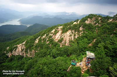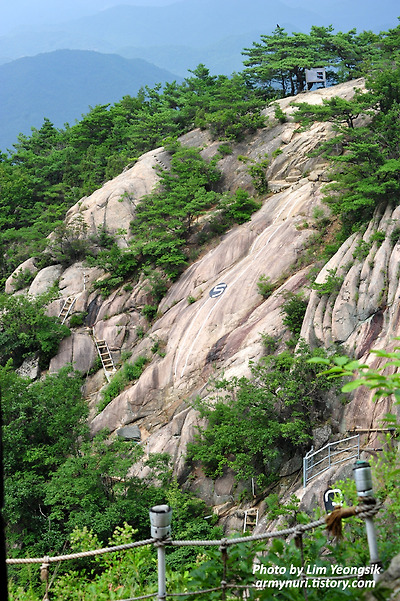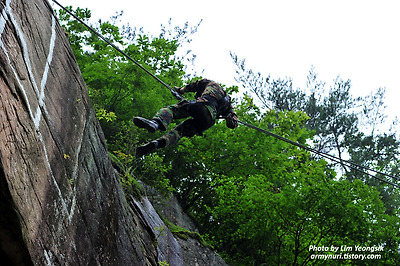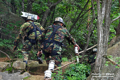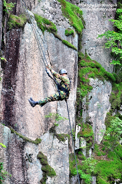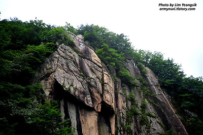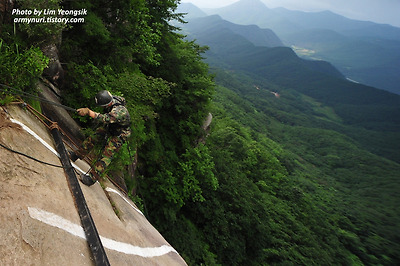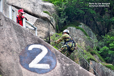 아파트 10~15층 높이와 같은 화산유격대의 산악유격코스 중 R1에서 R7까지의 암벽은 정말 장관이었습니다. 멋진 장관에 한번 뛰어 보고 싶은 충동이 마구 일었지만, 그냥 사진이나 열심히 찍어야겠지요~