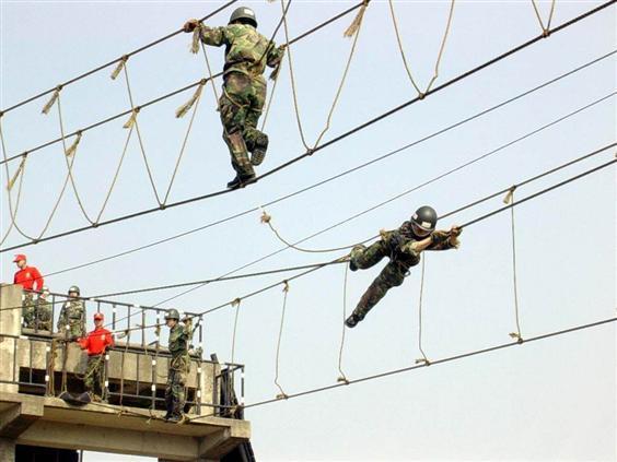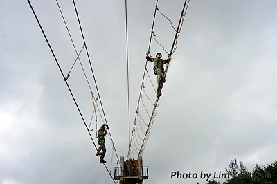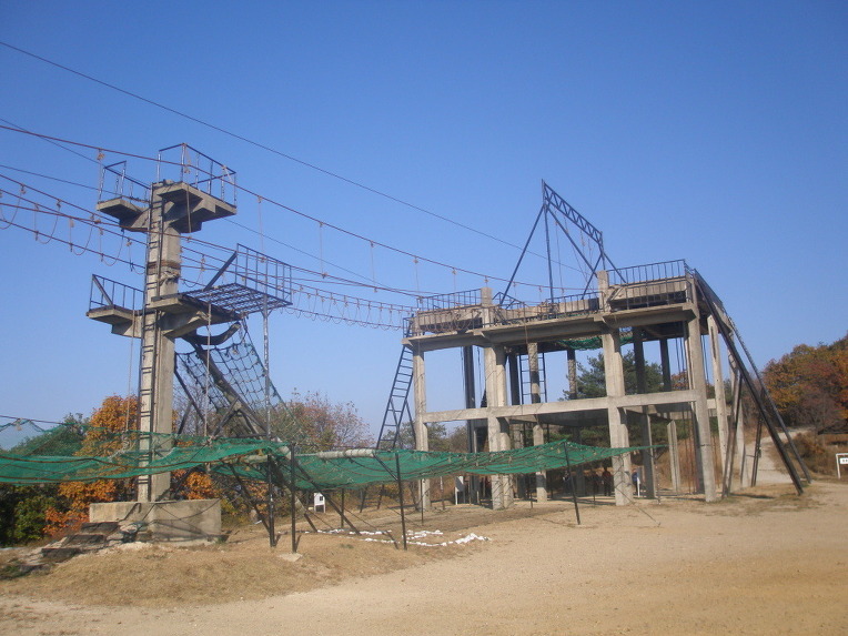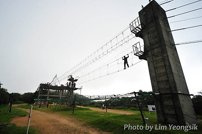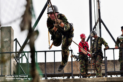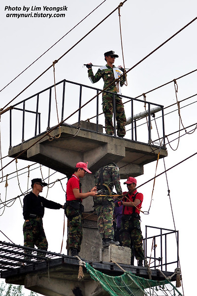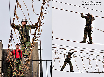산악유격장에 도착하자 가장 먼저 눈에 들어 온 외줄타기를 하고 있는 교육생...