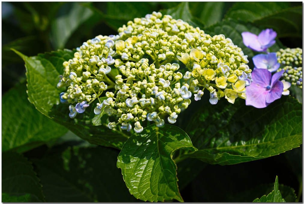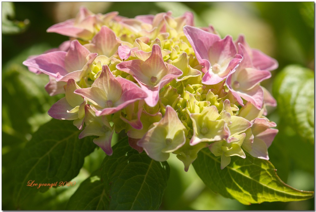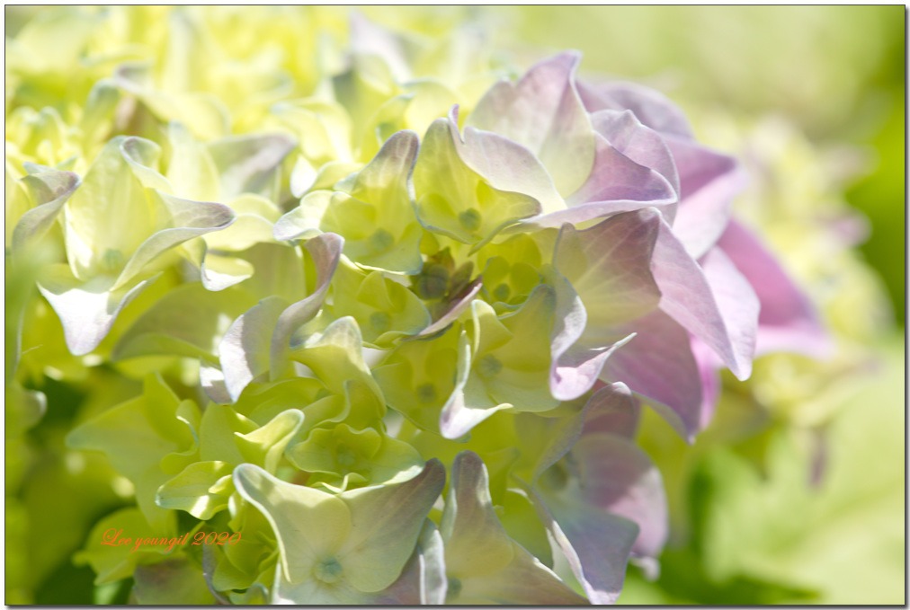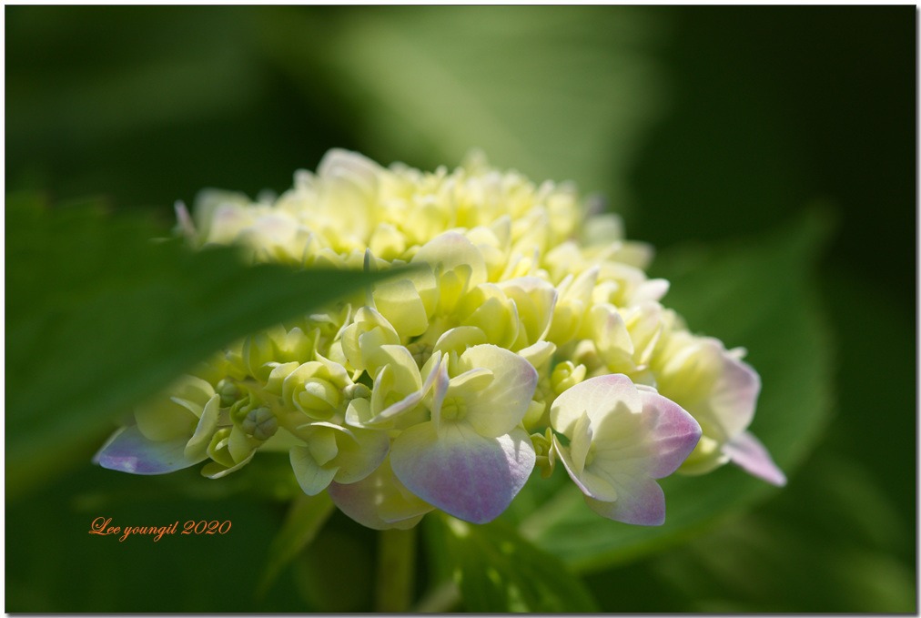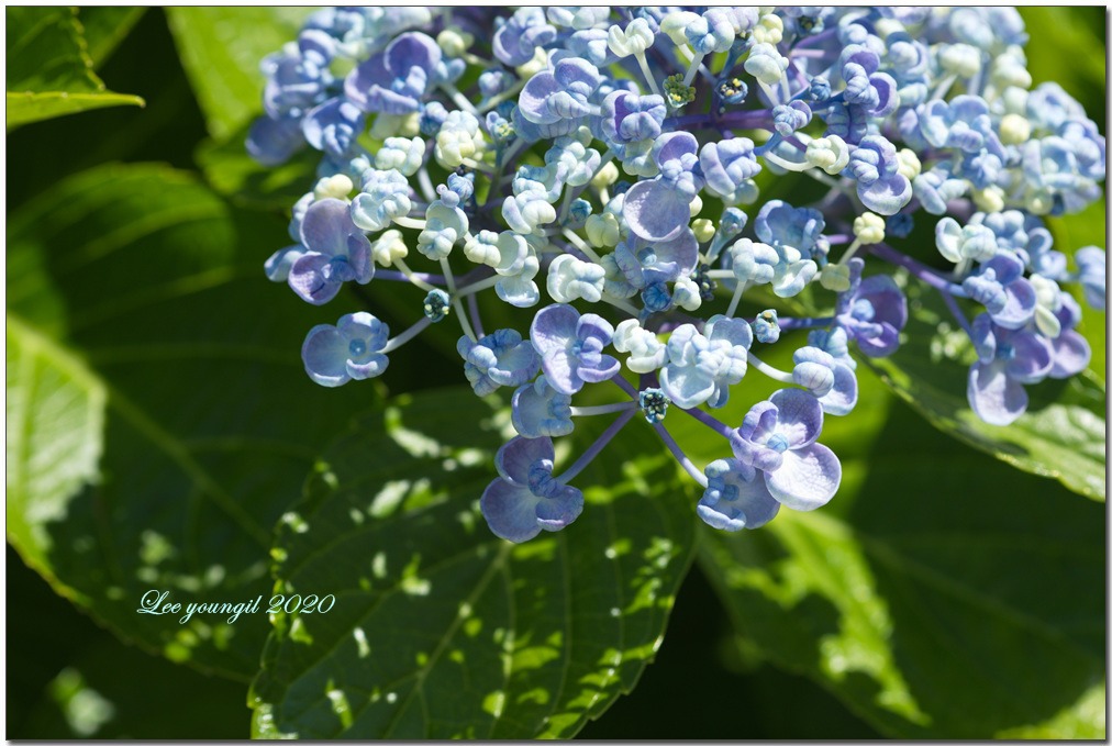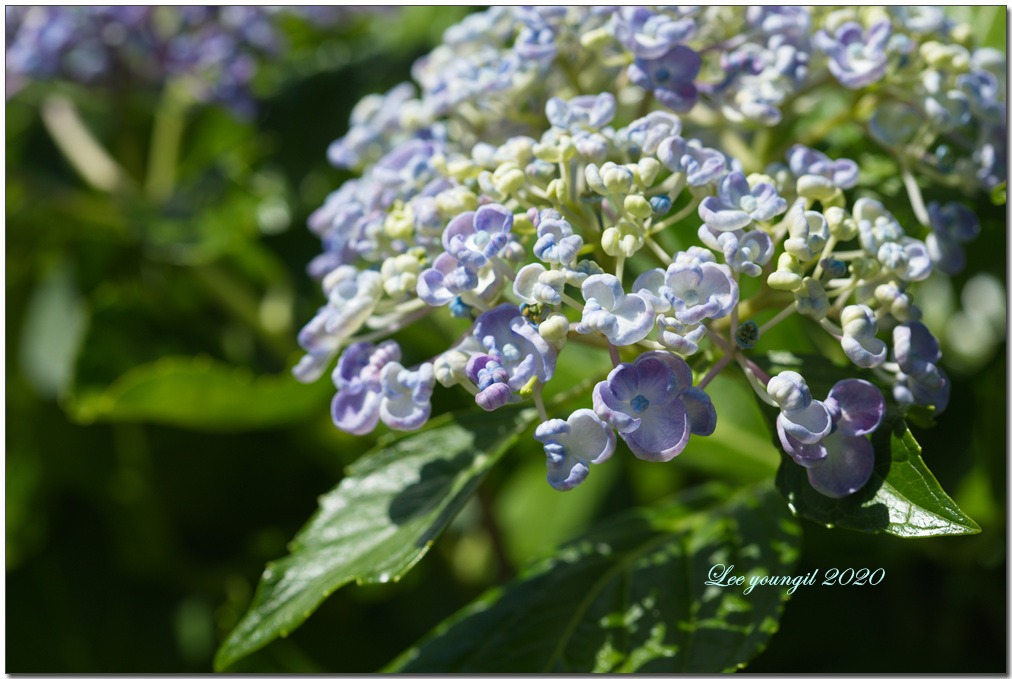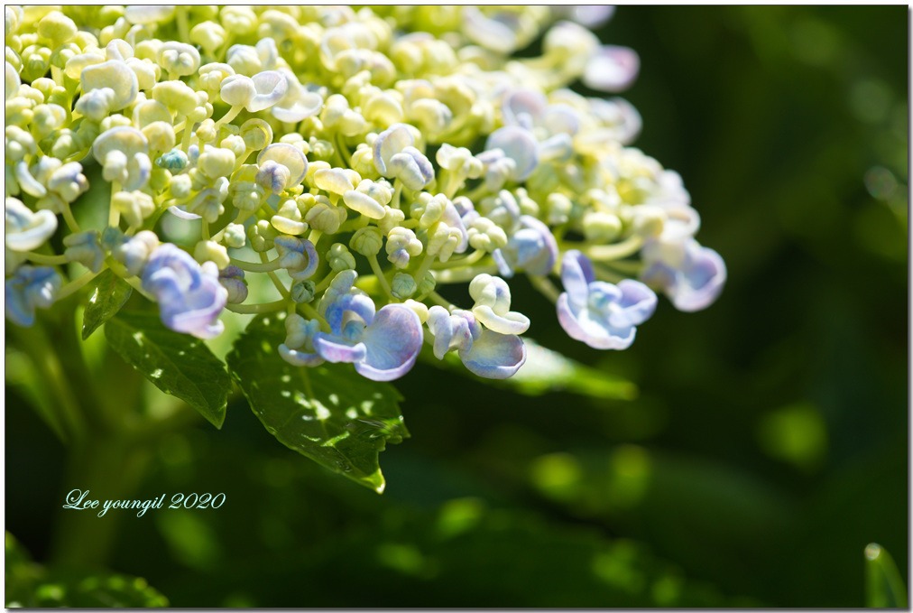 꽃은 중성화로 6∼7월에 피며 10∼15cm 크기이고 산방꽃차례[繖房花序:무한꽃차례의 하나. 꽃자루가 아래쪽의 꽃일수록 길고 위쪽의 것일수록 짧아 각 꽃이 거의 평면으로 가지런하게 핀다.]로 달린다. 꽃받침조각은 꽃잎처럼 생겼고 4∼5개이며, 처음에는 연한 자주색이던 것이 하늘색으로 되었다가 다시 연한 홍색이 된다. 꽃잎은 작으며 4∼5개이고, 수술은 10개 정도이며 암술은 퇴화하고 암술대는 3∼4개이다. 토양이 강한 산성일 때는 청색을 많이 띠게 되고, 알칼리 토양에서는 붉은색을 띠는 재미있는 생리적 특성을 갖는다. 그래서 토양에 첨가제를 넣어 꽃색을 원하는 색으로 바꿀 수도 있다.