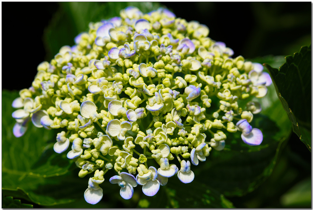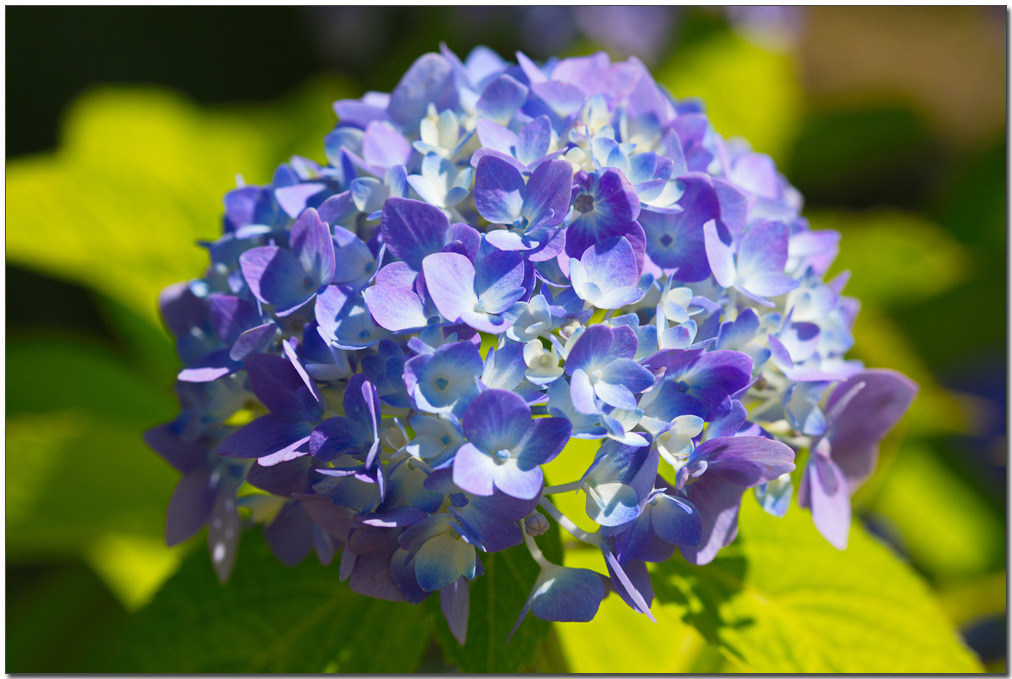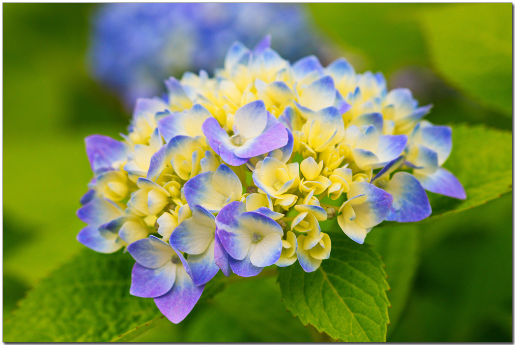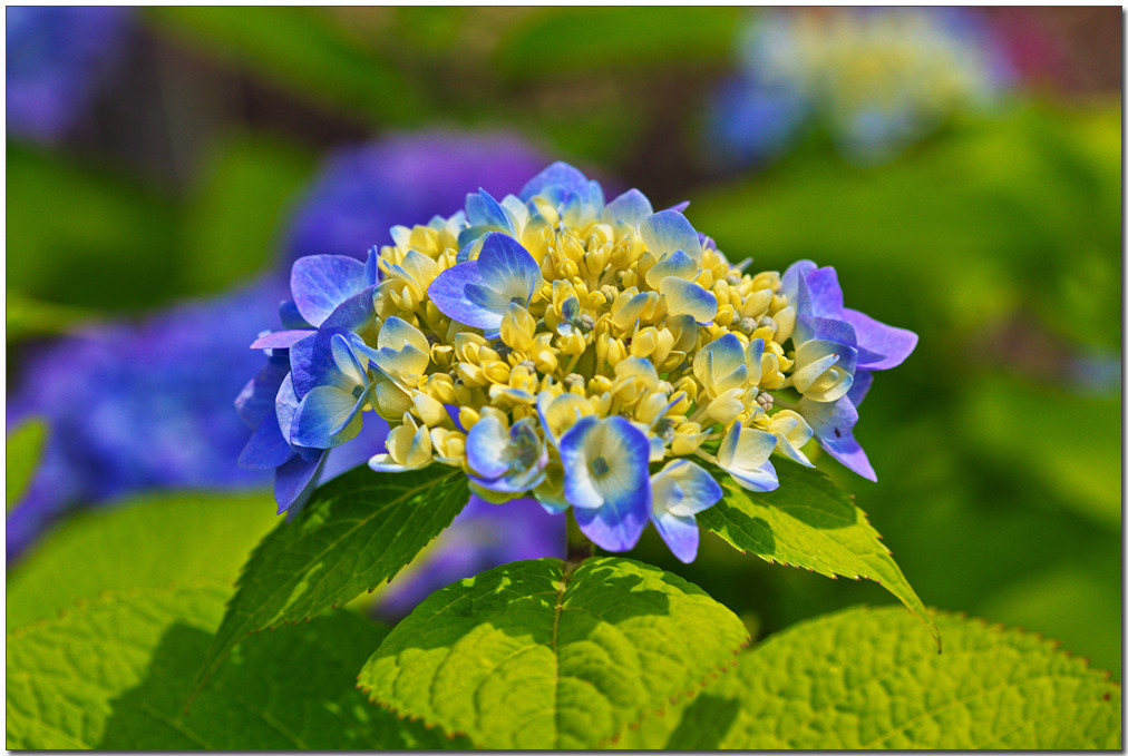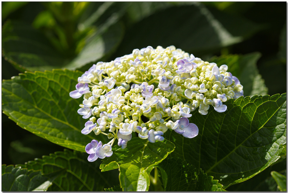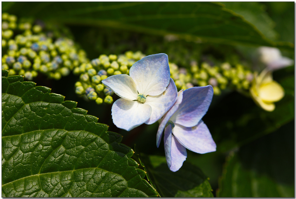 꽃은 중성화로 6∼7월에 피며 10∼15cm 크기이고 산방꽃차례[繖房花序:무한꽃차례의 하나. 꽃자루가 아래쪽의 꽃일수록 길고 위쪽의 것일수록 짧아 각 꽃이 거의 평면으로 가지런하게 핀다.]로 달린다. 꽃받침조각은 꽃잎처럼 생겼고 4∼5개이며, 처음에는 연한 자주색이던 것이 하늘색으로 되었다가 다시 연한 홍색이 된다. 꽃잎은 작으며 4∼5개이고, 수술은 10개 정도이며 암술은 퇴화하고 암술대는 3∼4개이다. 토양이 강한 산성일 때는 청색을 많이 띠게 되고, 알칼리 토양에서는 붉은색을 띠는 재미있는 생리적 특성을 갖는다. 그래서 토양에 첨가제를 넣어 꽃색을 원하는 색으로 바꿀 수도 있다.