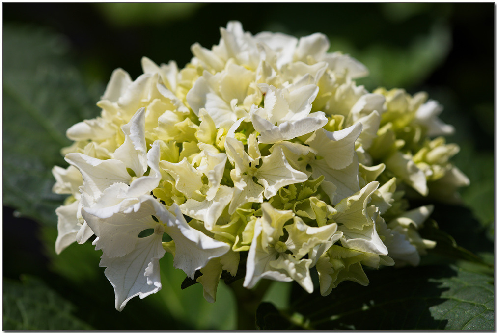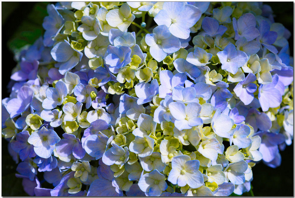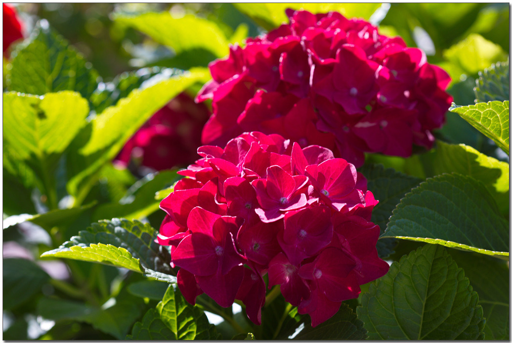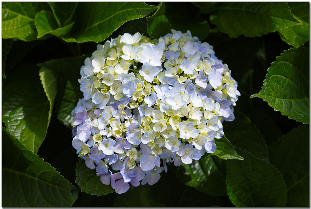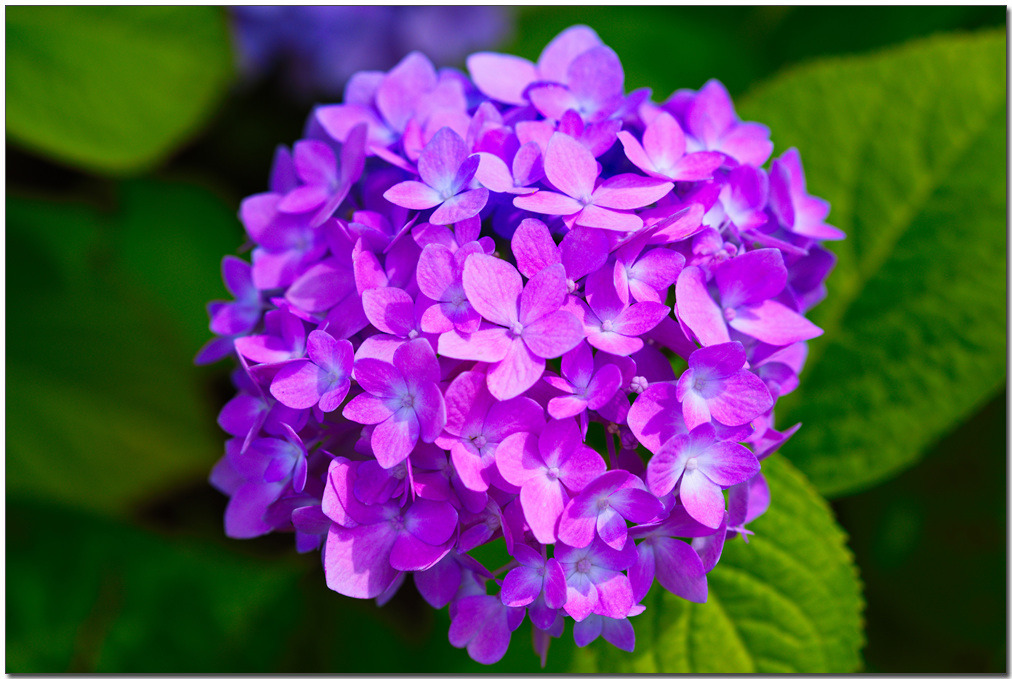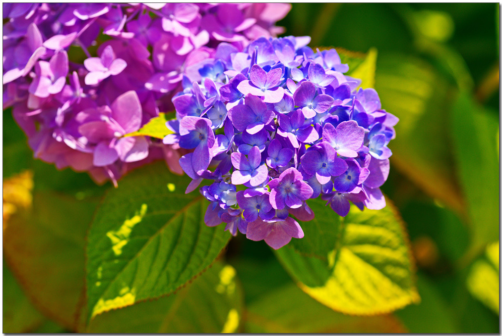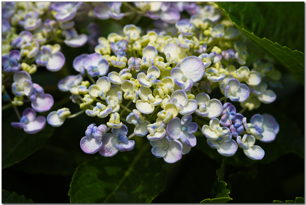 꽃은 중성화로 6∼7월에 피며 10∼15cm 크기이고 산방꽃차례[繖房花序:무한꽃차례의 하나. 꽃자루가 아래쪽의 꽃일수록 길고 위쪽의 것일수록 짧아 각 꽃이 거의 평면으로 가지런하게 핀다.]로 달린다. 꽃받침조각은 꽃잎처럼 생겼고 4∼5개이며, 처음에는 연한 자주색이던 것이 하늘색으로 되었다가 다시 연한 홍색이 된다. 꽃잎은 작으며 4∼5개이고, 수술은 10개 정도이며 암술은 퇴화하고 암술대는 3∼4개이다. 토양이 강한 산성일 때는 청색을 많이 띠게 되고, 알칼리 토양에서는 붉은색을 띠는 재미있는 생리적 특성을 갖는다. 그래서 토양에 첨가제를 넣어 꽃색을 원하는 색으로 바꿀 수도 있다.