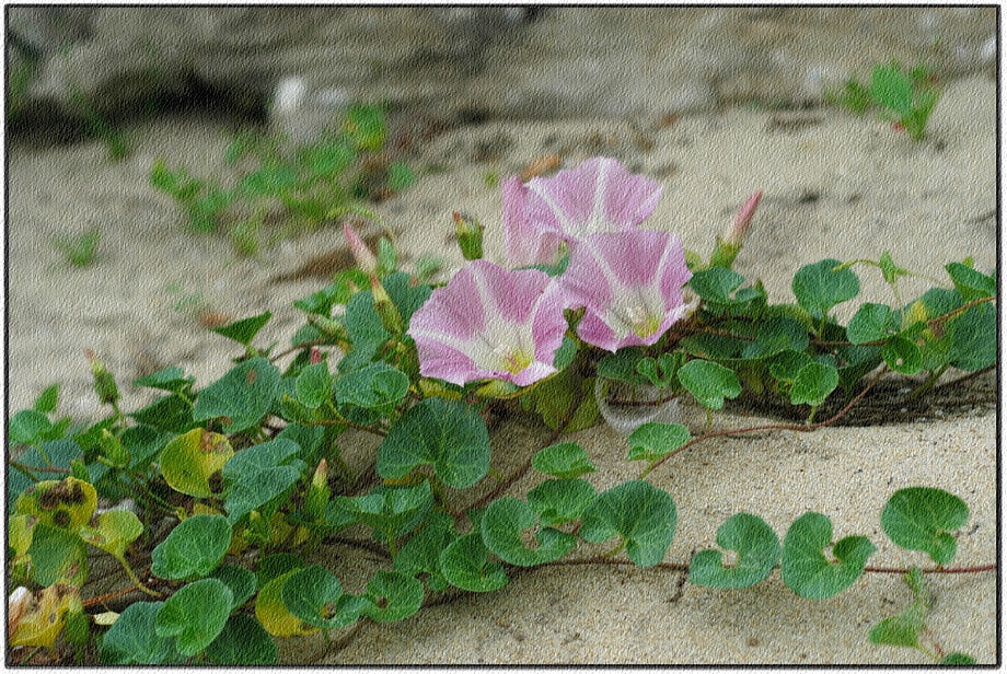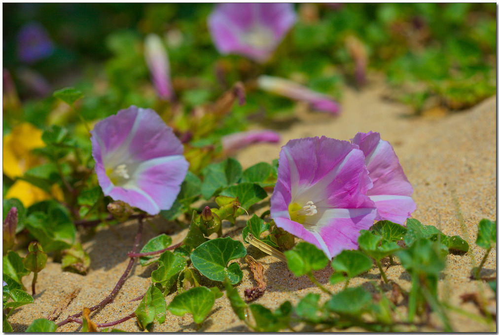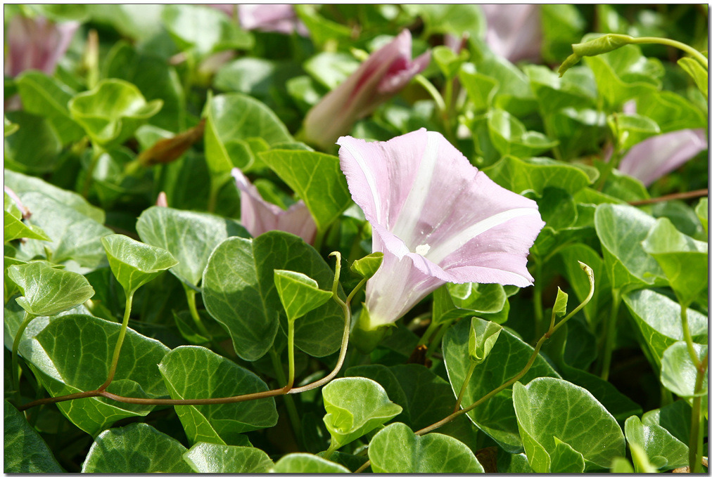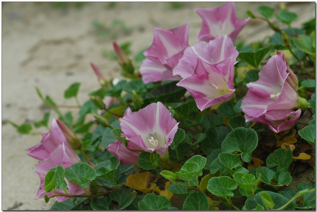 전 세계 온대 및 아열대지역에 폭넓게 분포한다. 중부지방 이남의 바닷가 모래땅에 흔하게 자라는 해안 사구식물(砂丘植物)이다. 땅속줄기는 굵고, 옆으로 길게 뻗는다. 줄기는 땅 위를 기거나 다른 물체를 감고 올라가며, 길이 30-80cm다. 잎은 어긋나며, 신장형, 끝이 오목하거나 둥글고, 가장자리에 물결 모양 톱니가 있다. 두껍고 윤기가 난다.