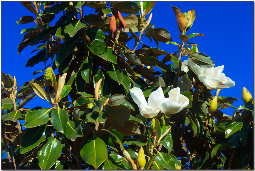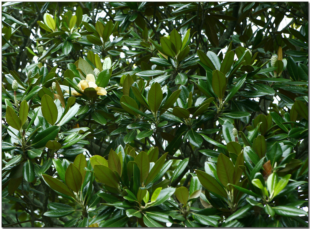 북아메리카 원산이며 한국의 남부지방에 분포한다. 목련속(Magnolia) 식물 가운데 유일하게 상록성이고, 높이 약 20~30m이다. 가지와 겨울눈에 털이 난다. 잎은 어긋나고 긴 타원형이거나 긴 달걀을 거꾸로 세워놓은 모양이고 길이 10∼20cm, 나비 5∼10cm이다. 끝이 둔하고 혁질(革質:가죽 같은 질감)이다. 겉면은 짙은 녹색으로서 윤기가 있고 뒷면에는 갈색 털이 빽빽이 나며 가장자리가 밋밋하다. 잎자루는 길이 2∼3cm이다.