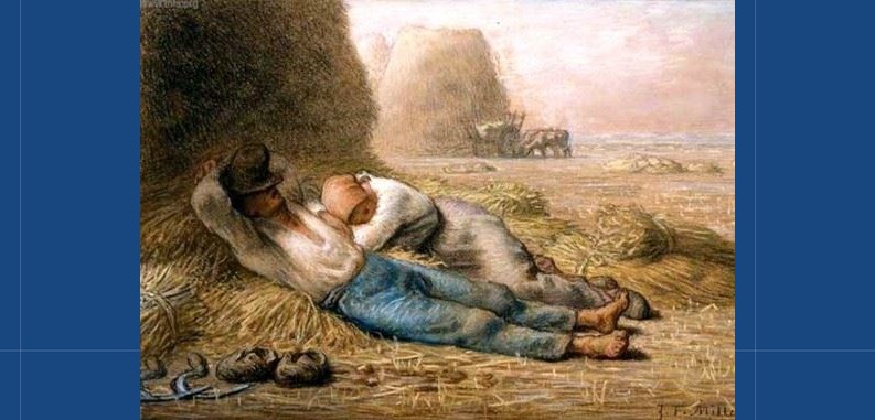〈낮잠〉캔버스에 유채, 밀레 - 밀을 수확하던 중 낮잠에 빠져 든 농부 부부의 모습을 그렸다.