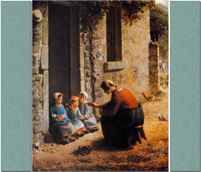 〈수프를 떠먹이는 어머니〉밀레 1860년, 의자에 걸터앉아 아이들에게