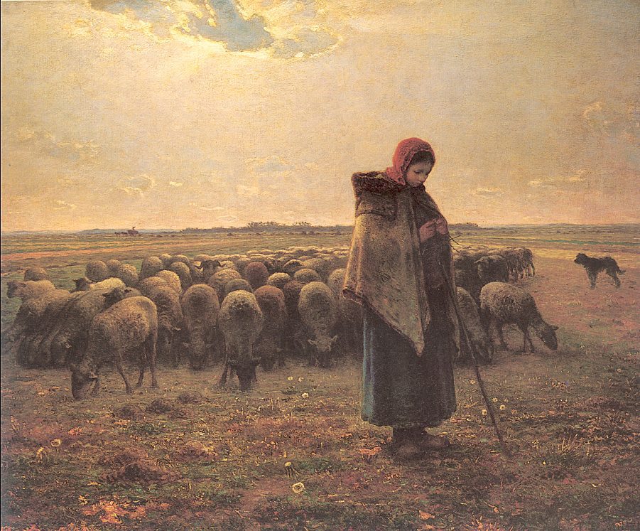 1849년 밀레는 '추수하는 사람들'(The Harvesters)를 그려 국가에 기증하였다. 파리 살롱에서는 같은 해에 '숲의 가장자리에 앉아 있는 양치기'(Shepherdess Sitting at the Edge of the Forest)라는 작품을 전시했다. 이 작품은 매우 작은 유화작으로 이전까지 그가 그려왔던 미화되고 목가적인 주제에서 보다 더 사실적이고 화가 개성적인 기법을 사용했다. 같은 해 6월 그는 파리에 콜레라가 유행하자 파리의 교외인 바르비종으로 옮기고, 본격적인 농민 화가로서 전원 생활의 정경을 그렸다. 그는 가난에 쪼들렸으나 신념을 굽히지 않고, 농민의 모습을 종교적인 분위기로 심화시켜 소박한 아름다움으로 표현하였다.