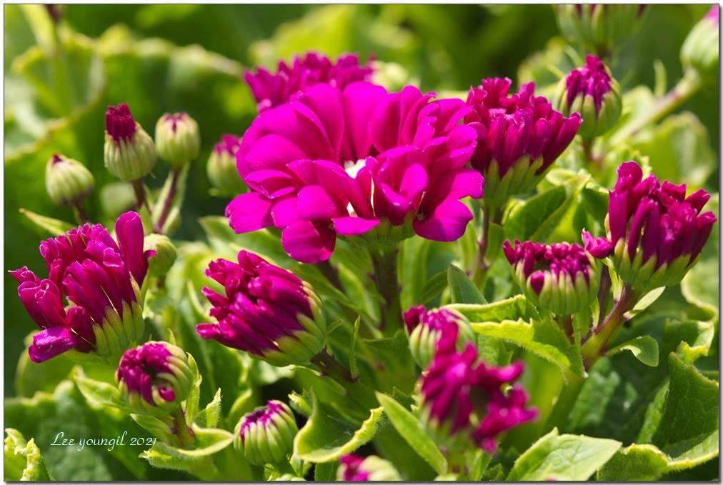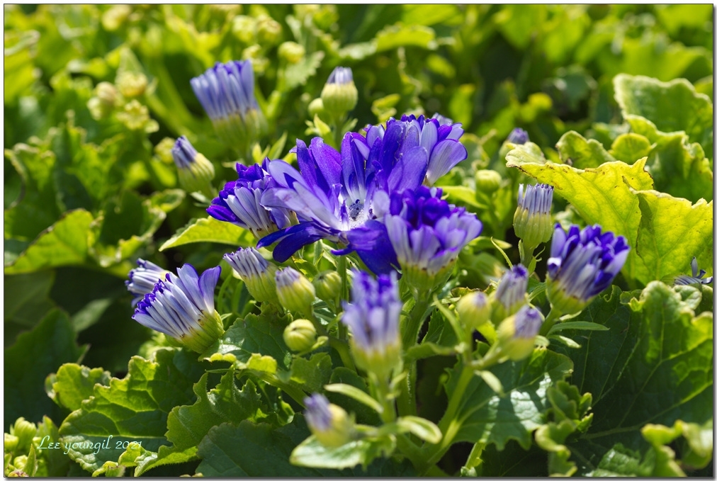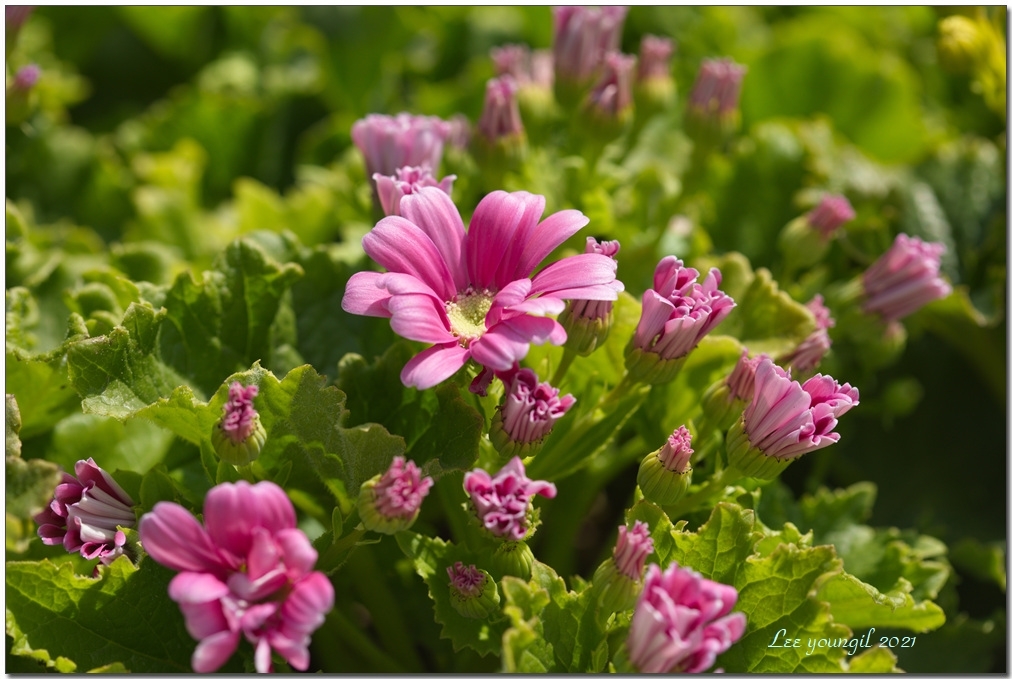 시네라리떠오르는 듯한 꽃의 색깔 때문에 ´항상 빛남´, ´항상 즐거움, 기쁨충만´이라는 꽃말이 붙어 있는 시네라리아. 이 꽃의 이름은 라틴어의 Senex(노인)에서 유래된 말인데 세넥스는 노인이라는 의미로 꽃이 지고 난 후 종자가 떨어진 화반을 노인의 대머리에 비유한데서 비롯된 것이다. 종소명 cruentus는 라틴어로 ‘피투성이의’란 의미로 시네나리아가 여러 색의 꽃을 피우지만 그 중에서도 대표적인 붉은 색 꽃이 피를 뿌린 듯하다 해서 붙여진 이름이다. 이 꽃의 매력은 뭐니뭐니해도 다채로운 꽃빛깔에 있다. 짙은 노랑과 까망 이외의 모든 색을 골고루 가지고 있으며 우아하고 탐스러워서 많은 여성들에게 사랑받는 꽃이다. 다정한 연인끼리 주고 받거나 또는 문안용으로도 많이 이용되고 있다.