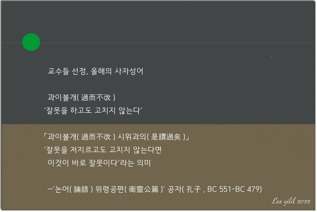 11일 교수신문에 따르면 전국 대학교수 935명을 설문조사한 결과 50.9%(476명)가 ‘과이불개’를 올해의 사자성어 1위로 꼽았다. 이는 ‘논어(論語) 위령공편(衛靈公篇)’에 처음 등장하는 표현으로, 공자는 “과이불개(過而不改) 시위과의(是謂過矣)”라고 말했다. ‘잘못을 저지르고도 고치지 않는다면 이것이 바로 잘못이다’라는 의미다.