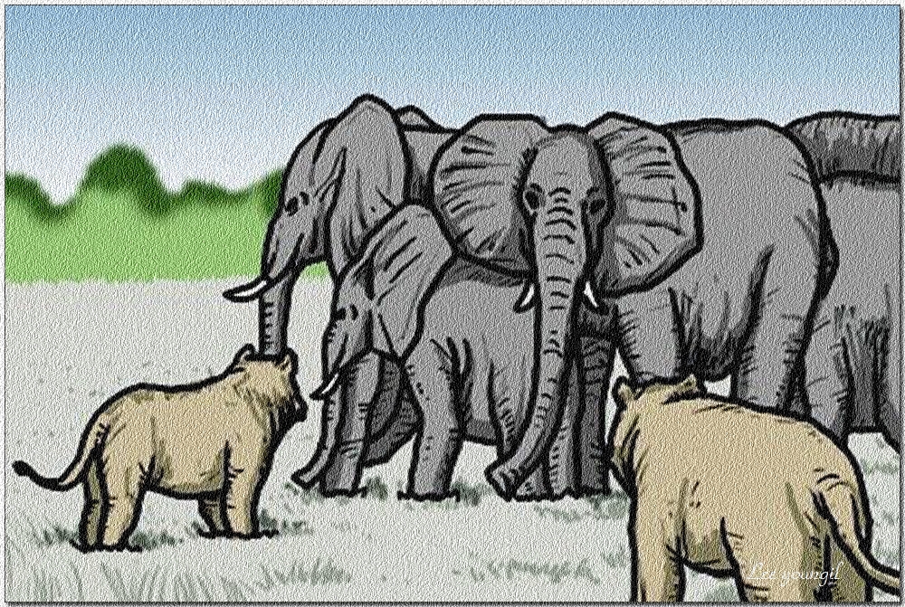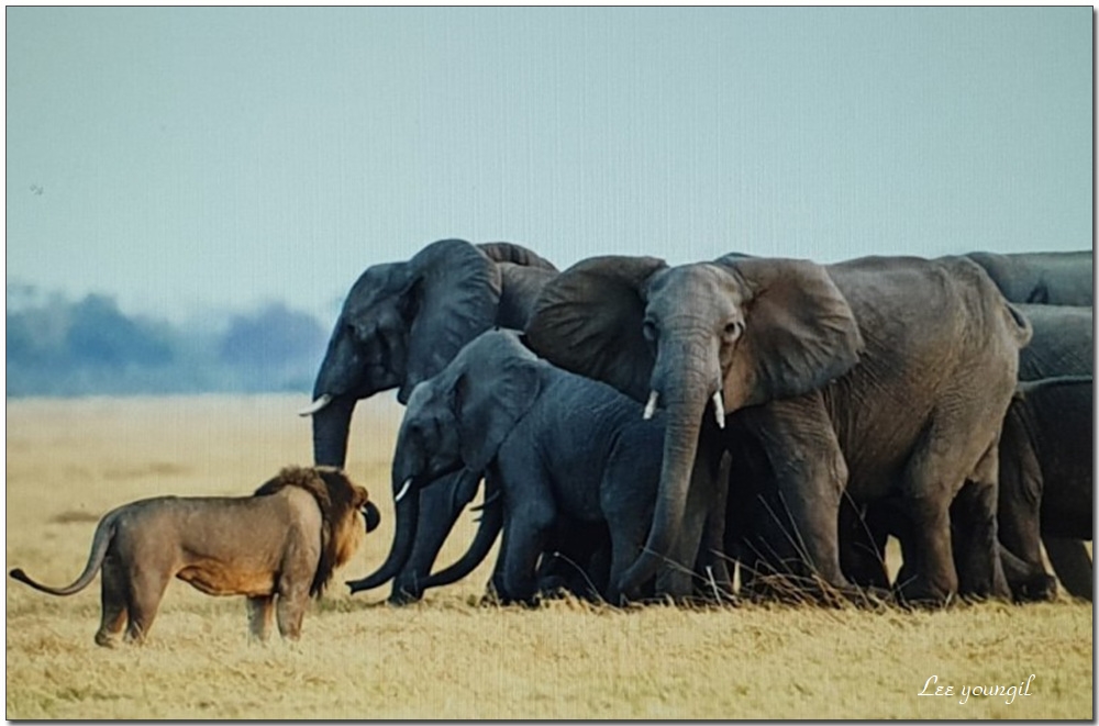 하지만 기회는 만드는 것. 사자들은 많은 숫자를 이용해 끈질기게 여기저기를 쑤시고, 이런저런 공격으로 굳건한 대열을 흔든다. 보통은 끄떡하지도 않지만, 가끔 대응에 서투르거나 겁을 먹고 대열을 이탈하는 코끼리들이 있어서다. 목걸이 한 곳의 연결 상태가 그 목걸이 전체의 연결 강도이듯 이 거대한 성벽도 마찬가지. 한 곳이 뚫리면 전체 대열이 무너지는 건 순식간이다.