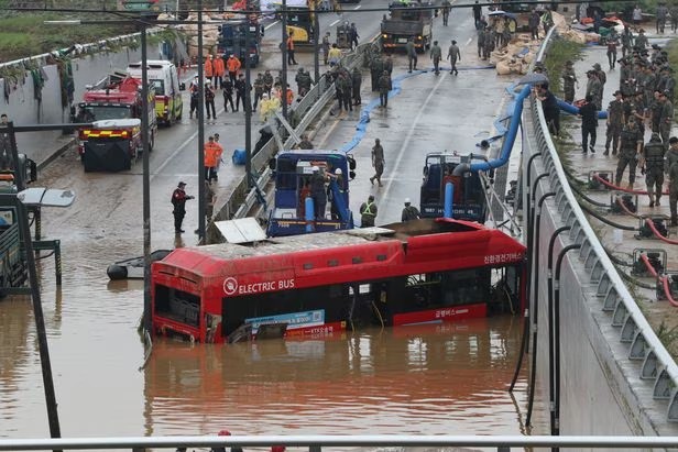 7월 16일 미호강 임시 제방 유실로 강물이 넘치면서 침수된 충북 청주시 오송읍 궁평2지하차도에서 소방당국이 물빼기 작업을 벌이고 있다. / 뉴스1