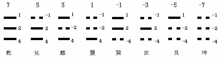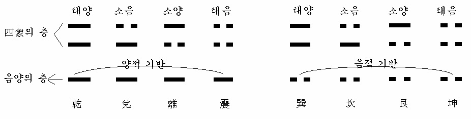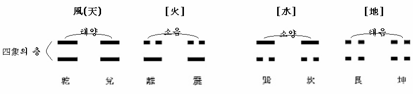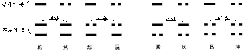 다음은, 다시 팔괘의 층을 복원시키고 보면 이제는 팔괘의 뜻이 보인다. 위에서 소음은 사대의 화에 대응한다 했다. 그런즉 소음 위에 양을 加하면 명실공히 火가 되고, 음을 加하면 "厚重한 大地" 아래 양기가 준동하는 震木이 된다. 소양은 四大의 水에 대응한다 했다. 그런즉 소양 위에 음을 加하면 명실공히 水가 되고, 양을 加하면 하늘로 흩는 바람이 된다.