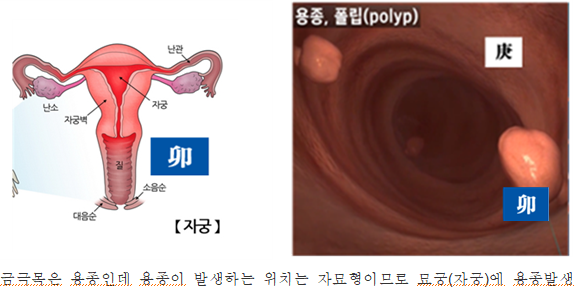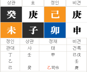 형살이기에 질환으로 특정한다. 특히 자수보다 묘목에 탈이 생기는 이유는 금극목에 있다. 경신금이 강하고 묘신암합하니 묘(卯)중 을목(乙木)과 신(申)중 경금(庚金)이 을경(乙庚)암합으로 목기운이 거의 사라지면 목(木)에 허실이 오게 된다. 이러한 허(虛)한 목(木)에 차가운 수가 유입(流入)이 되면 묘목(卯木)은 자궁(子宮)에 해당하기 때문에 자궁(子宮)에 냉증질환이 발생하게 된다.