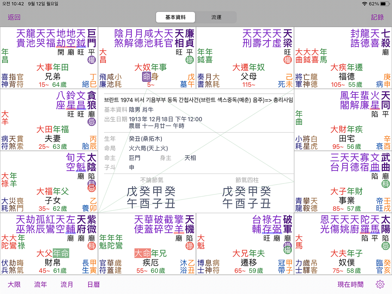 ⨀갑甲이 전택궁에 있으며, 염정화록이 부처궁에 들어가고, 생년록을 법하면 부모궁에 있어, 대표하는 것은, 자녀를 낳아 부모가 되었을 때 반드시 “치산置産”한다는 것이다.