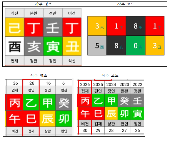 집안에서 반대가 심한 이유는 년주 丁丑(비견+식신)이 집안의 가문인데 丙午년 丙이 겁재로 비견 세력 강화 → 대운도 乙巳대운이라서 더욱 1/2코드:비견 세력이 강화되어서 주변의 간섭과 충돌이 심화되어서 부딪히는 상황과 부합한다.