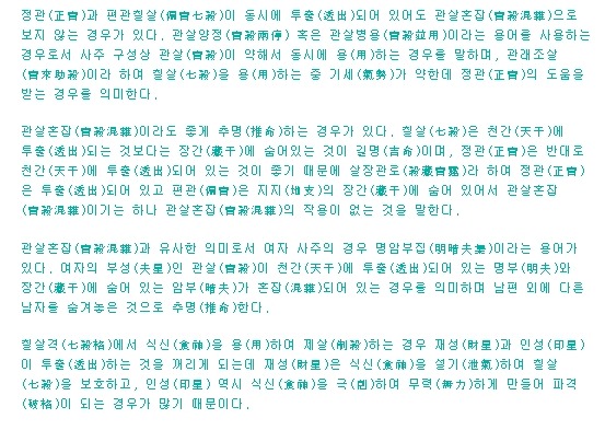 고로 이 격을 놓은 여명은 여러번 개가 하거나 아니면 사연(私戀)을 맺어 출입이 빈번하게 되므로 자기의 불행한 것은 말할 것도 없거니와 가정의 연고자들도 상심됨이 많게 되고, 또 사회적으로는 풍기질서를 문란시키기 쉬운 사주 격이나 거류서배(去留舒配)가 잘 되어 있으면 반귀(反貴)하게 된다.