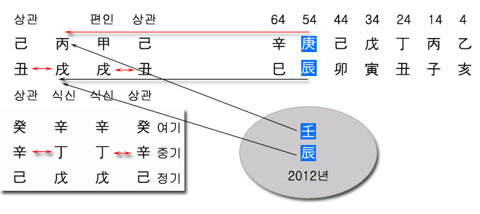 ▶ 상황은 여기서 끝나지 않고 2012년 임진년을 맞이하고 있는데 세운천간 壬水는 일간에 대한 편관/기신으로 사주원국의 일간/丙火를 丙-壬상충으로 가격하고 세운지지 辰土가 합세하여 일지/월지의 식신 戌土를 辰-戌상충으로 파극하니 이는 삼형/상충으로 인한 사주원국이 초토화 되는 것이라 어디하나 성한 곳이 없게 되었다.