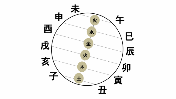 ② 묘술(卯戌)이 그 다음 위치로 초목에서 나온 따뜻한 공기가 위로 퍼져 올라간다. 그 공간에는 화기가 가장 강한데 동일 위도상에는 묘술(卯戌)이 돌고 있으므로 묘술(卯戌)은 화(火)가 강해진다