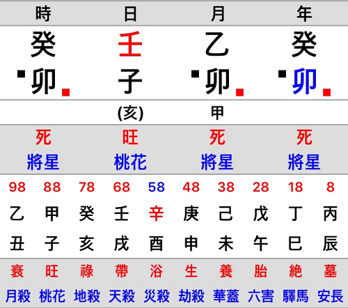 일간 壬은 일지 子에 제왕하고 있으니 일간이 강하다. 특히 壬이 子를 만나는 경우는 양인에 해당하여, 자신의 의지나 주장이 강하고 추진력도 강하다.