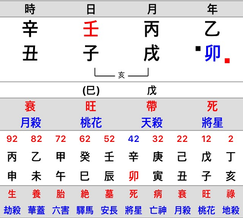 식상은 년간에 乙卯 상관이 드러나 있다. 하지만 卯는 공망이고, 丑子亥 대운에서는 쇠병사로 무력하다.