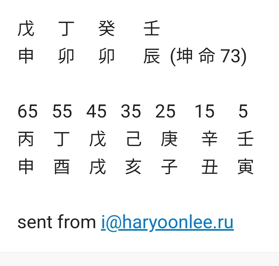 미용기술을 배워 돈을 제법많이벌고 戊戌대운엔 평택시의 외진곳(상관대운)에서 미용실을 했는데 대박이 났다고 들었고 젊은 남자를 만나 잘 살고 있다 하는데, 戌대운(51~55)엔
