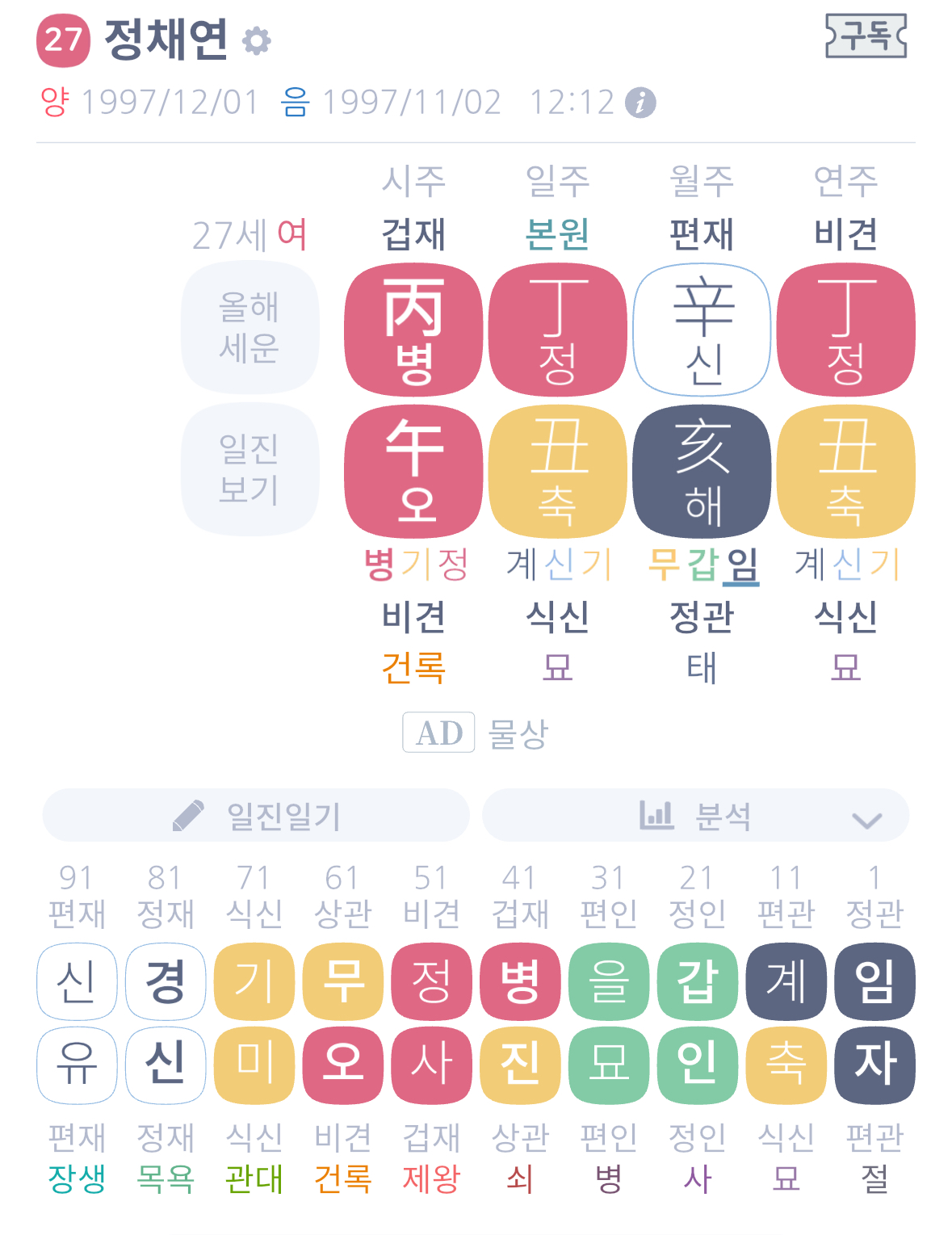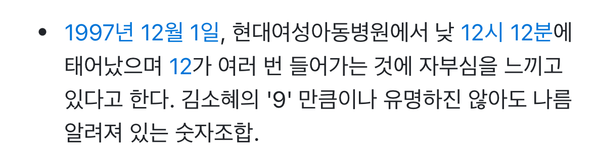 생시 알게 되서 올려봅니다. 팬미팅에서 자긴 낮 12시 12분에 태어나서 12라는 숫자와 인연이 깊은거 같다고 말했다네요. 팬들 사이에선 유명하다고 합니다.