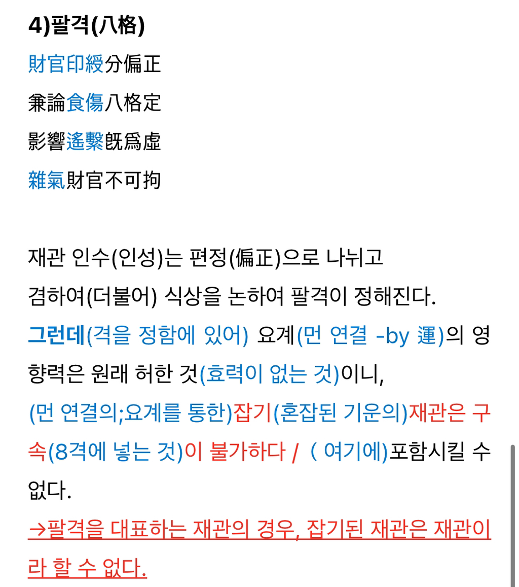 적천수_파트3_4)八格_잡기재관? 작성자한자도사|작성시간25.08.30|조회수134 목록 댓글 10 글자크기 작게가 글자크기 크게가 문맥적으로는 대략 이렇게 단순 해석이 되는데요, 잡기재관을 각자 어떻게 이해하고 계시는지 궁금합니다. 공통된 의견이 있는 것인지 아니면 이런 것도 의견이 갈리는지 궁금합니다. 다음검색 현재 게시글 추가 기능 열기 북마크 공유하기 신고 센터로 신고 댓글 댓글 10 댓글쓰기 답글쓰기 댓글 리스트 답댓글 작성자한자도사 작성자 본인 여부 작성자 | 작성시간 25.08.30 감사합니다. 그런데 만일 전체를 하나의 흐름으로 보지 않고 두 문장으로 보면, 불가구不可拘가 제대로 해석이 안되는데 이부분은 어떻게 생각하세요? 선생님은 이부분을 어떻게 해석하시는지 궁금합니다. 삭제된 댓글입니다. 답댓글 작성자한자도사 작성자 본인 여부 작성자 | 작성시간 25.08.30 삭제된 댓글입니다. 답댓글 작성자한자도사 작성자 본인 여부 작성자 | 작성시간 25.08.30 감사합니다. 댓글 전체보기