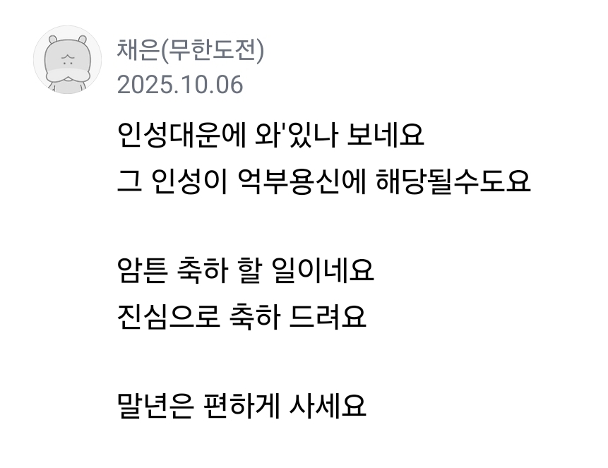 답댓글 작성자공부777 작성자 본인 여부 작성자 작성시간 25.10.11 본의 이니게 기분 언짢으셨다면 사죄드립니다.