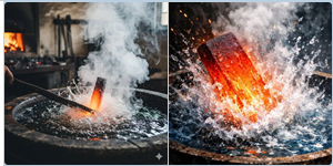| 년주의 검봉금이 일지 유(酉)자리 궁(宮)으로 들어오기만 하면 자신도 모르게 서서히 칼날이 녹이 슬고 냉랭해줘서 결국 하나둘 떠나간다. 무려 5명이나ㅡㅡ 더구나 년주의 검봉금의 특성상 금(金)은 계(癸)를 만나면 금(金)이 사오미(巳午未)=화국의 뜨거운 여름에 달궈진 쇳덩이가 마치 차가운 물에 닿는 순간 퍽 하고 수증기를 뿜는다. 그림처럼 화(火)에 뜨겁게 달궈진 경금 쇠는 수(水)를 만나면 담금질할 때 물이 지글지글 끓는다. 이처럼 급격히 水와 화학 작용을 해서 폭발 직전까지 가는데 이런 물상은 대개 알코올 중독자 남편이나 가정폭력을 일삼는 남자를. 반복하여 만나는 형상이다. 그로 인해 월주의 목도 금극목으로 상(傷)해서 열매 맺기도 전에 난도질을 당하니 수확 한 번 제대로 못 하고 헤어지기를 반복된 삶의 기구한 운명과도 같다. 이처럼 년주 검봉금(癸酉)이 일지(酉)로 들어오며 녹슬고 냉랭해지는 과정을 알코올 중독이나 가정폭력 같은 극한의 물상으로 풀어내는 것은 기존 오행으로는 절대로 풀리지 않는다. 또 쇠(金)가 물(癸)을 만나 급격히 식으며 수증기를 뿜는 '폭발적 반응'을 폭력성과 연결하는 부분은 실전 임상에서 유용하게 사용될 귀한 해석이다. |
