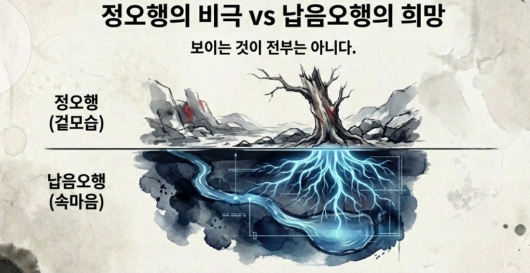 월주의 석류목(辛酉)은 단단한 껍질 속에 보석 같은 알갱이를 품은 나무다. 하지만 년주의 검봉금(癸酉)이라는 날카로운 칼날이 월주와 일주를 향해 휘두르니, 이 나무는 열매를 맺기는커녕 껍질조차 보존하기 힘들다. 석류목은 원래 속이 꽉 찬 결실을 의미하는데, 여기에서는 칼날에 베인 '상처 입은 나무'가 된다. 이는 그녀가 결혼할 때마다 "이번에는 결실(안정)을 보겠지"라고 기대하지만, 검봉금의 숙살지기(肅殺之氣)가 그 열매를 맺기도 전에 잘라버리는 반복적 좌절을 의미한다. (서슬 퍼런 숙살의 기운이 운에서 들어오는 글자들과 충돌하거나 합하며 발생한 에너지의 결과) ‘천중수(泉中水)’의 고립: 씻어내지 못한 금기(金氣) 일주의 **천중수(乙酉)**는 맑은 샘물이다. 원래는 금생수(金生水)로 그 강한 금기들을 씻어내어(汰) 평화를 찾아야 하는데, 주변에 酉金이 너무 많아 샘물이 감당을 못한다. : 물이 금을 씻어내는 것이 아니라, 너무 많은 금에 의해 물이 '금다수탁(金多水濁)' 혹은 '금다수질(金多水窒)'이 되어버렸다. 맑아야 할 샘물이 쇳가루 섞인 핏물이나 오염된 물처럼 변하니, 명주의 정신적 고통과 환경적 오염(폭력, 알코올)이 얼마나 극심했을지 납음의 질감으로도 느껴진다. 마지막 6혼(酉丑合)의 비밀: 검봉금을 녹이는 ‘금고(金庫)’ 65세 이후 정축(丁丑)년의 유축합(酉丑合)이 왜 그토록 길었을까? 납음으로 보면 丑은 벽력화(霹靂火)나 상천토(壁上土)의 기운이 아니라, 지지 자체로 금의 창고(金庫)로 본다. 다른 시각: 그동안 날뛰던 검봉금들이 비로소 丑이라는 창고 안으로 수렴(收斂)된 것이다. 이는 마치 날카로운 칼이 칼집에 들어간 형상이다. 이제야 칼날이 나를 향하지 않고 제자리를 찾았기에 명주도 비로소 '사람답게 살고 있다'는 소회를 남길 수 있었던 것이다. |