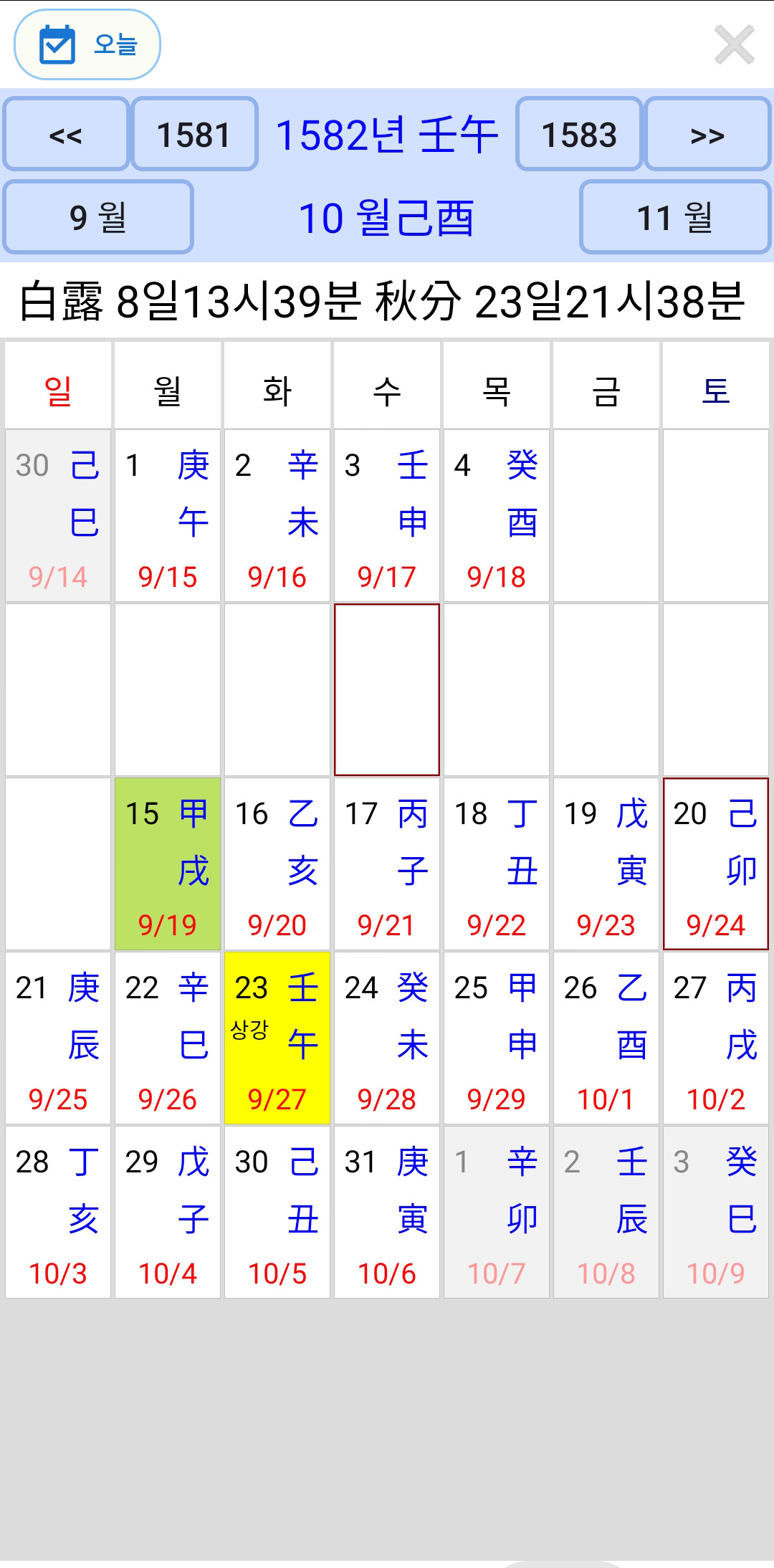 -> 10월 15일을 갑술(甲戌)로 해야. 지금 사용하는 일진과 맞습니다.
