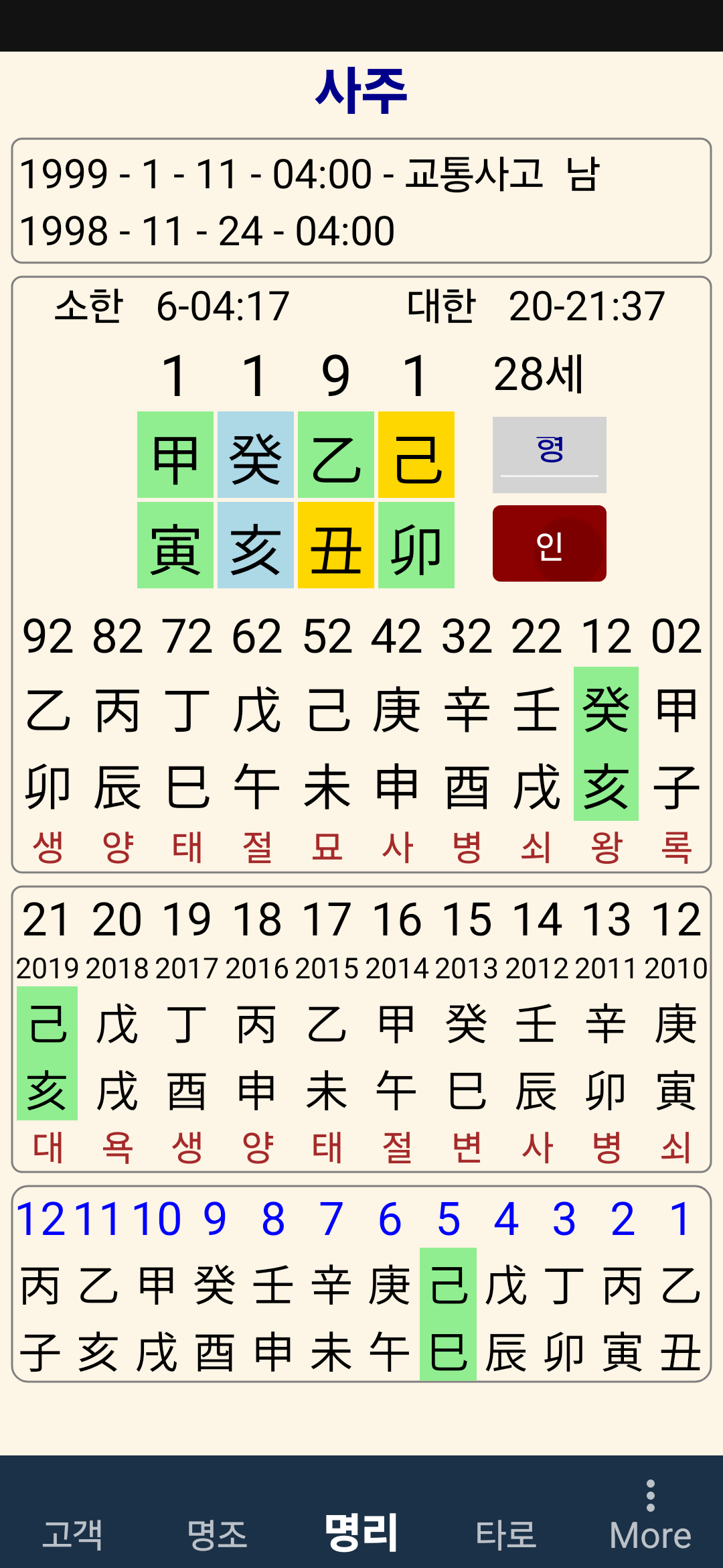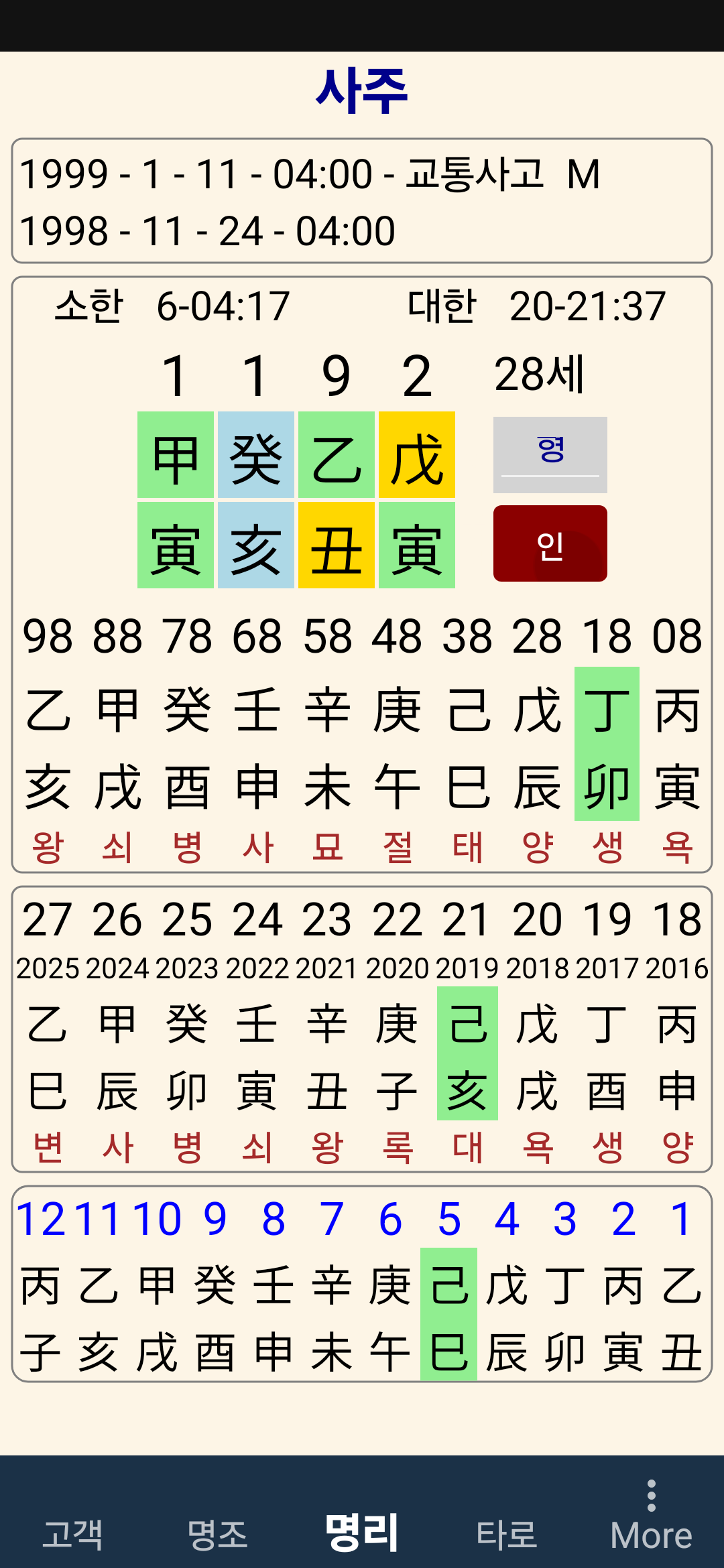 이 명조는 21세인 2019년 5월 8일 새벽 3시 (기해년 기사월 을사일)에 쿄통사고로 귀천한 사람이다.