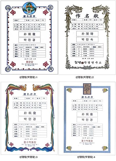 상단의 이미지는 작명전용용지에 인쇄하는 경우이며 별도 상호를 알려주시면 프로그램에 상호를 넣어드리고 아래 이미지는 4가지중 3가지는 전용용지가 아닌 일반용지에 출력되어 인쇄하는 경우입니다. 취향에 맞게 선택하여 사용하시면 됩니다. 성명해설은 프로그램에서 자동으로 나오나 해