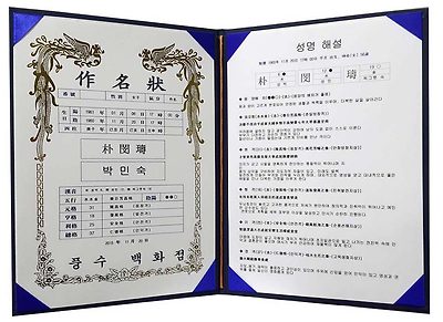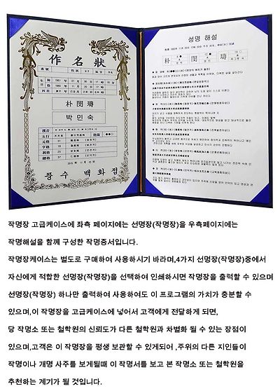 아래 이미지는 작명프로그램을 사용하여 최종 작명이 확정되어 출력한것을 작명케이스에 넣어 작명을 의뢰한 분에게 주는 것으로 하단의 "풍수백화점" 상호는 구매자의 상호에 맞게 수정이 가능합니다.