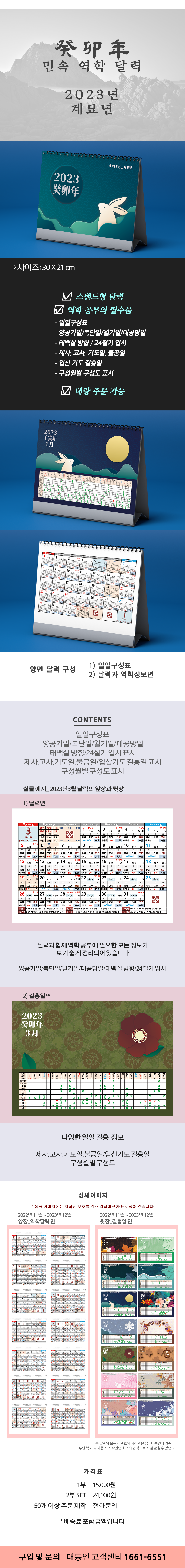 사주 공부 전용 2023년 민속 역학 달력 작성자서로사랑해|작성시간22.12.26|조회수400 목록 댓글 0 글자크기 작게가 글자크기 크게가 2023년 생활 사주 달력 (사주를 위한 정보가 모두 달력 안에 있어요!) 2023년 대통인 생활 사주 달력 구입은1661-6551 전화로 하실 수 있습니다 :) 다음검색 현재 게시글 추가 기능 열기 북마크 공유하기 신고 센터로 신고 댓글 댓글 0 댓글쓰기 답글쓰기 댓글 리스트