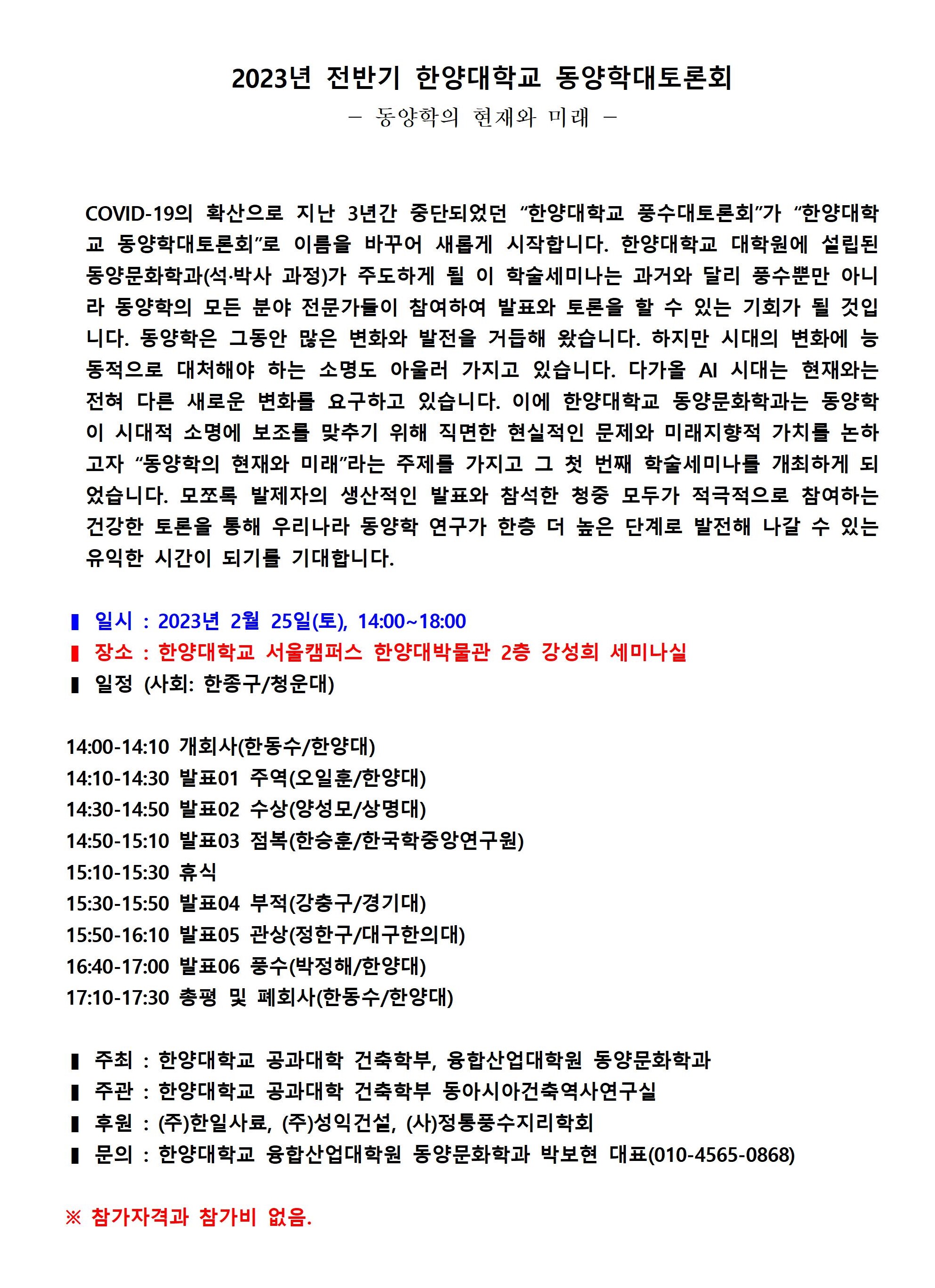 2023 한양대학교 동양학대토론회 안내 작성자박정해|작성시간23.01.26|조회수125 목록 댓글 0 글자크기 작게가 글자크기 크게가 다음검색 현재 게시글 추가 기능 열기 북마크 공유하기 신고 센터로 신고 댓글 댓글 0 댓글쓰기 답글쓰기 댓글 리스트