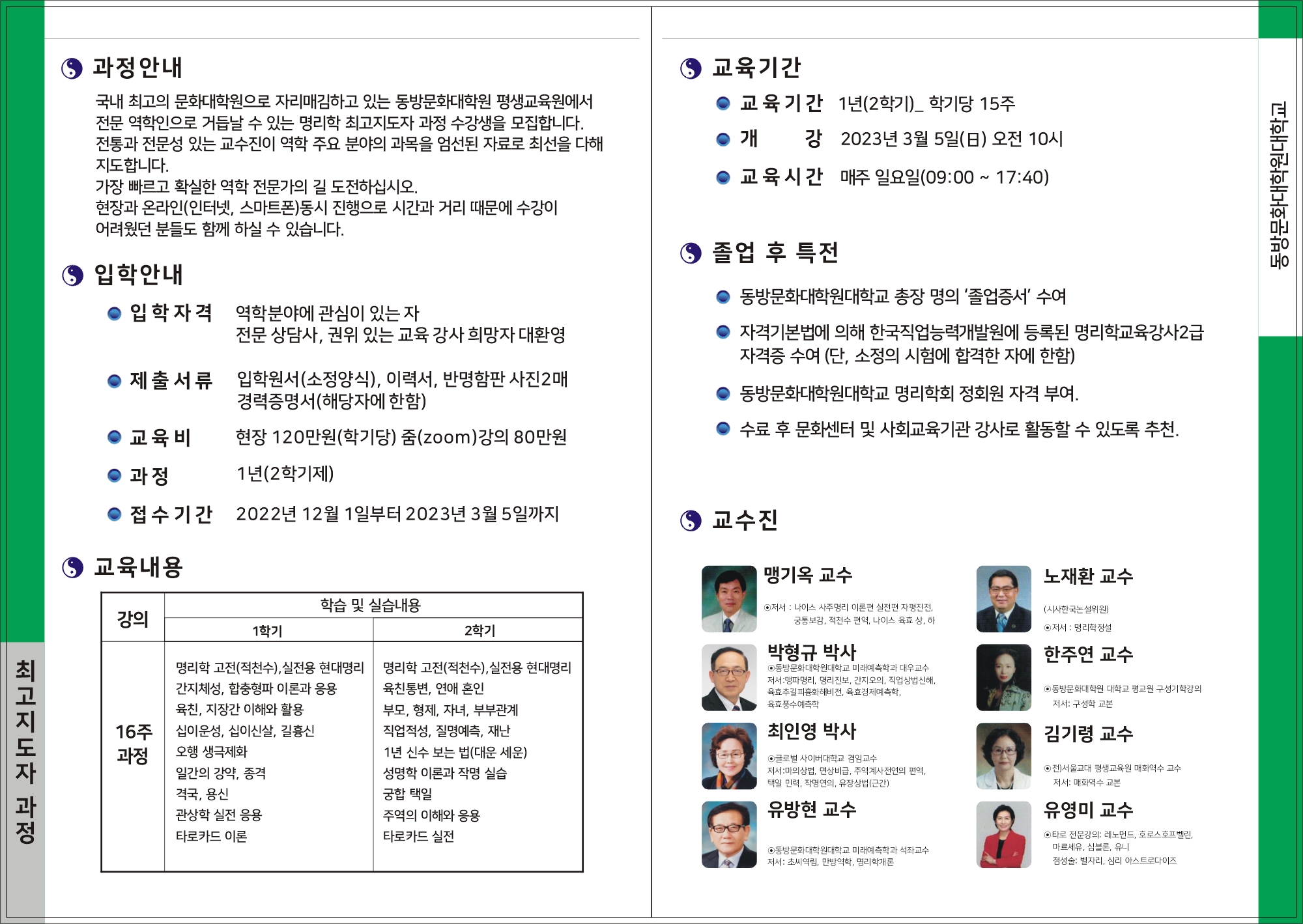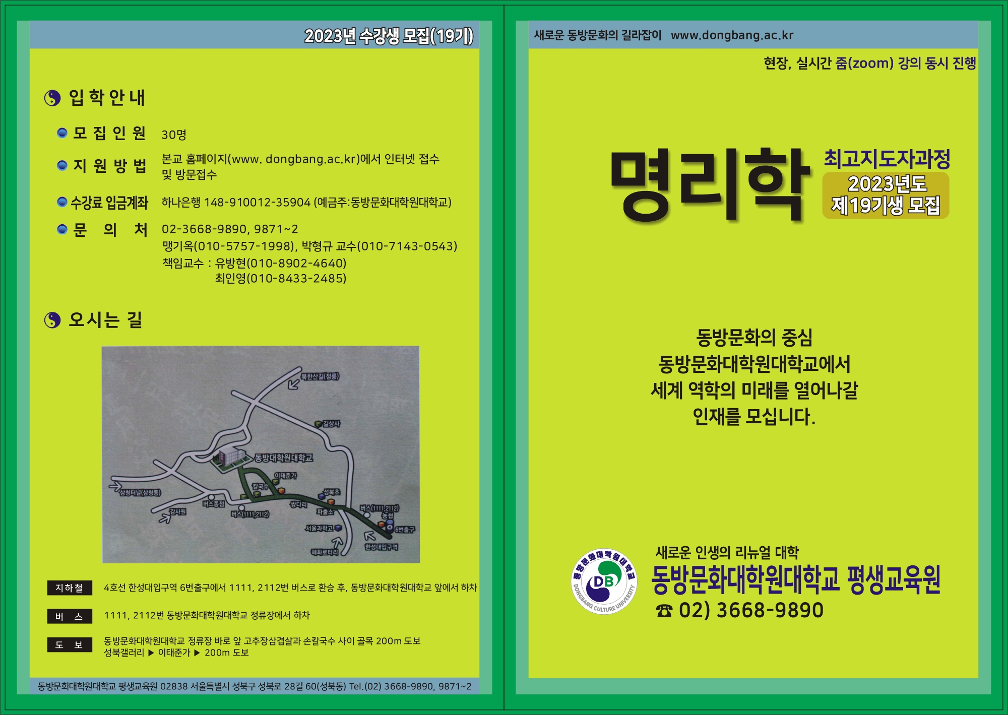 [강의홍보][2023년 동방대학교대학원 평생교육원 명리학 최고위과정] 모집 작성자ktsa|작성시간23.02.02|조회수152 목록 댓글 0 글자크기 작게가 글자크기 크게가 다음검색 현재 게시글 추가 기능 열기 북마크 공유하기 신고 센터로 신고 댓글 댓글 0 댓글쓰기 답글쓰기 댓글 리스트