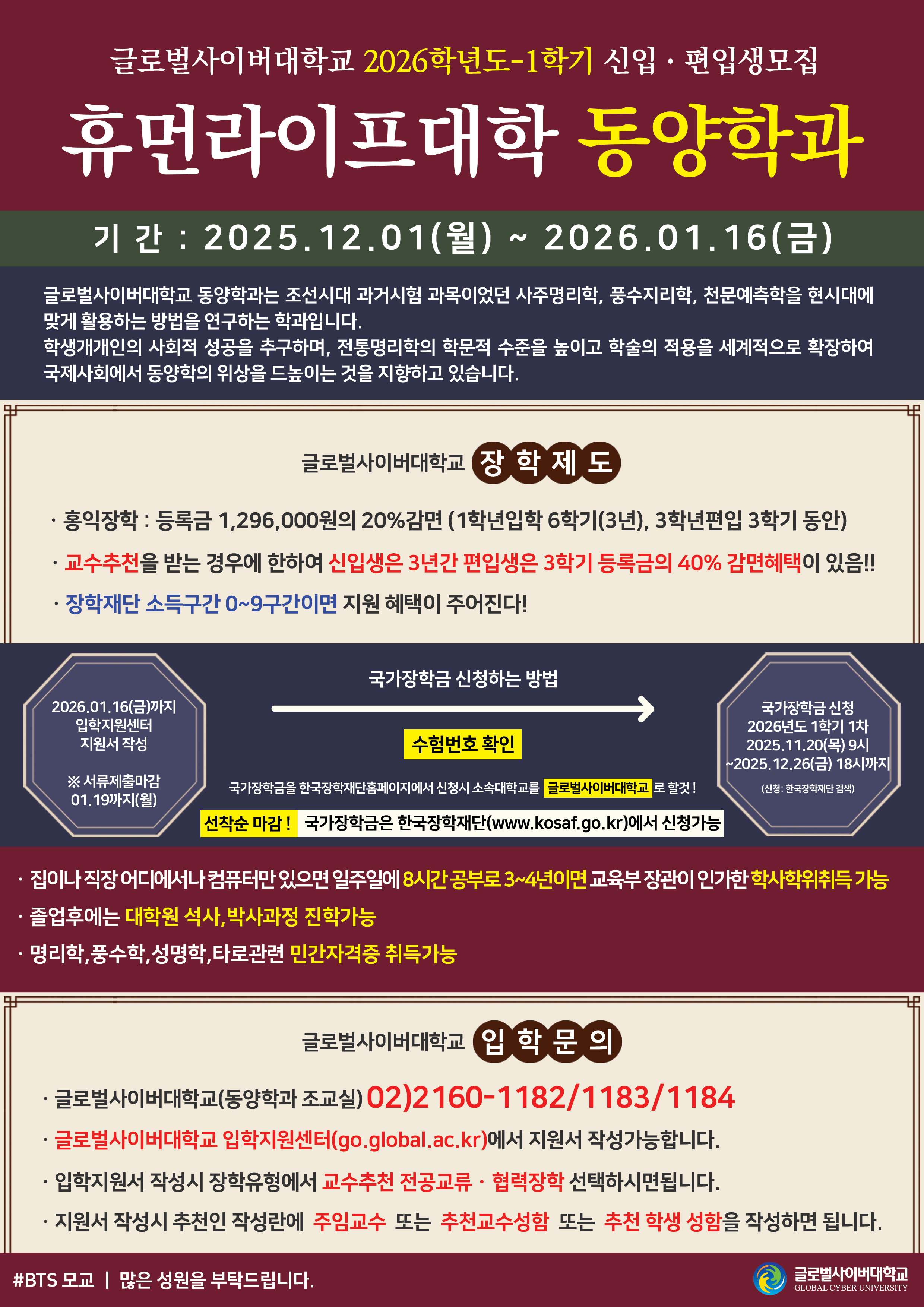 명리풍수타로점성전공 동양학과 학사과정 학생모집(2026.1.16.마감) 작성자장미화|작성시간25.12.26|조회수90 목록 댓글 0 글자크기 작게가 글자크기 크게가 다음검색 현재 게시글 추가 기능 열기 북마크 공유하기 신고 센터로 신고 댓글 댓글 0 댓글쓰기 답글쓰기 댓글 리스트