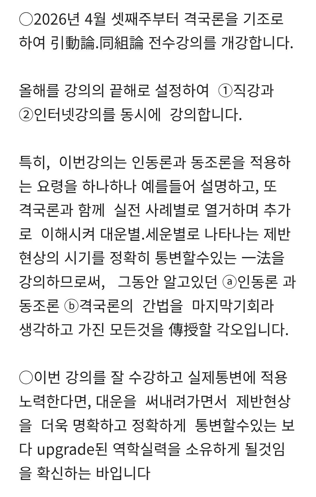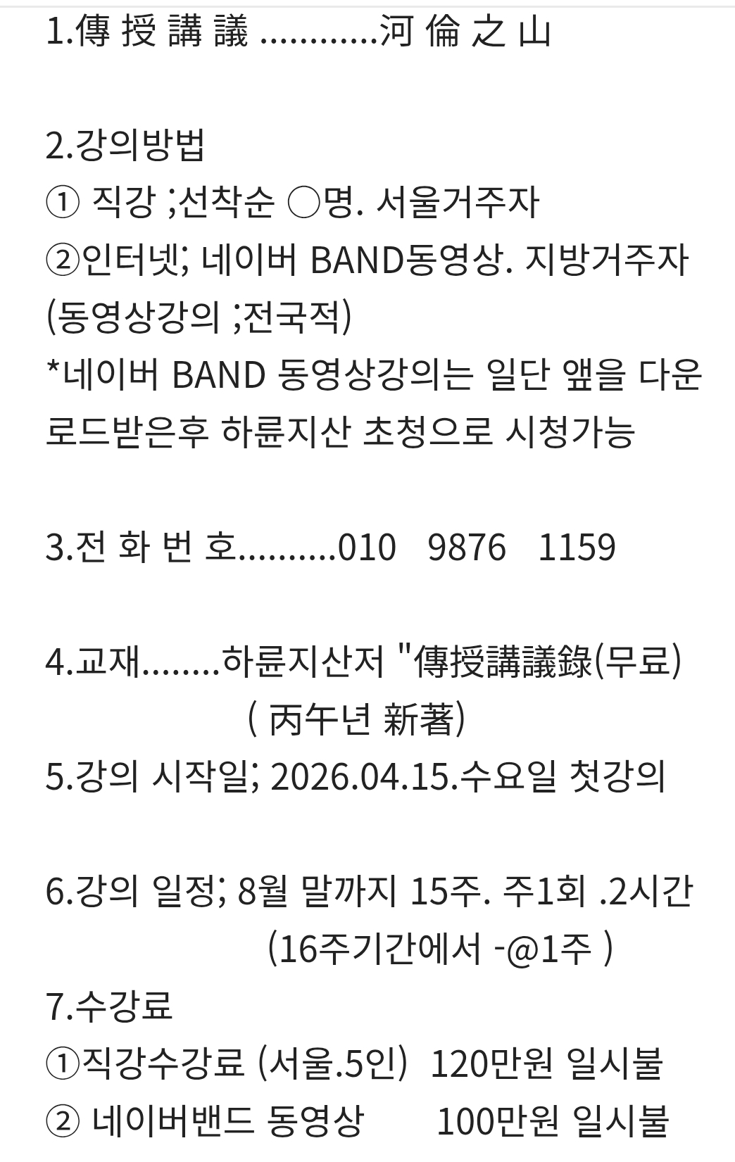 ●2026 秘技 ,格局論 사례. 引動論.同組論 傳授강의 작성자河 倫 之 山 ( 亮 軒 )|작성시간26.03.31|조회수120 목록 댓글 1 글자크기 작게가 글자크기 크게가 *Band동영상은 시간대와 상관없이 하시라도 시청할 수 있읍니다. 강의 시간대는 출퇴근 시간대를 고려하여 조정해나갈수 있읍니다. 다음검색 현재 게시글 추가 기능 열기 북마크 공유하기 신고 센터로 신고 댓글 댓글 1 댓글쓰기 답글쓰기 댓글 리스트 작성자河 倫 之 山 ( 亮 軒 ) 작성자 본인 여부 작성자 | 작성시간 26.03.31 계좌번호 신한은 이국종010 9876 1159*입금후 거주지주소와 E-mail 주소를 보내주시면 교재도 보내드리고 네이버 밴드 초청드립니다.*교재 발송기간을 고려하여 빠른신청 부탁드립니다. 댓글 전체보기