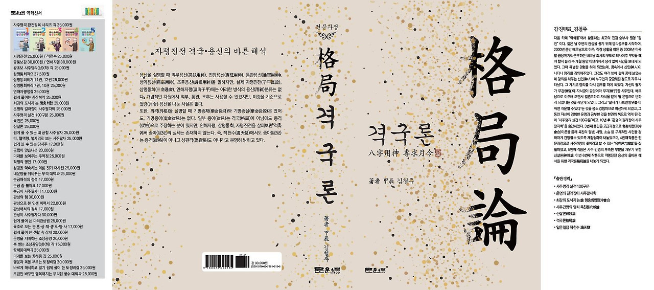 미리보기 ▶ https://product.kyobobook.co.kr/book/preview/S000218171531 【책 소개】 우리가 알고 있는 격국론(格局論)은 심효첨의 자평진전(子平眞詮)을 말하며, 본 도서는 자평진전의 원문을 번역하고, 서락오의 주석을 참고하여 재정립하였다. 명리를 공부하는 분이라면 격국(格局)이라는 진법을 깨우쳐야 한다. 운명을 판단하는데 있어서 격국(格局) 보다 더 우수한 기법은 없기 때문이다. 이러한 상황을 잘 이해하고 격국론 (格局論)을 공부한다면 실력이 일취월장할 것이다. 목차(目次) 서문 1장 자평진전에서 가르쳐 주지 않는 진실 1. 개두(蓋頭)와 절각(截脚)의 개념. 2. 구응신(救應神)이란 무엇인가. 3. 중관(重官)에 대한 이해. 4. 동정론(動靜論)에 대한 이해. 5. 자평진전에 대해 잘못 알고 진실. 6. 비견겁재(劫財)는 상신(相神)이 될 수 없다. 7. 비견과 겁재는 왜 용신으로 잡을 수가 없는가. 8. 양인격(陽刃格)과 양인살(羊刃殺)에 대한 이해. 9. 삼합기상론(三合氣象論). 10. 용신(用神)의 변화(變化)에 대한 이해. 11. 육합(六合)으로 구성이 된 격국은 존재하는가. 12. 겁재(劫財)와 양인(陽刃)의 특수성을 밝히다. 13. 삼명학의 록(祿)과 자평학 건록(建祿)의 취용법은 전혀 다르다. 14. 취운법(取運法)이 필요한 이유는 무엇인가? 2장 형충회합(刑沖會合)의 해법 1 형충회합(刑庶會合)의 해법. 2 선취합(先取合) 이론. 3 합이불화(合而不化)에 대해 말하다. 4 음생양사(陰生陽死)와 12운성을 말하다. 5 득시(得時)해도 왕(旺)하지 않고 실시(失時)해도 약(弱)하지 않다. 3장 용신정해(用神精解)의 완성 1. 용신(用神)과 격국(格局)의 개념. 2. 용신(用神)을 구하는 법. 3. 상신(相神)을 찾는 방법. 4. 사길신(四吉神)은 순용(順用)한다. 5. 사흉신(四凶神)은 역용(逆用)한다. 6. 월령(月令)에 용신(用神)이 없을 때는 어찌할 것인가? 7. 용신(用神)의 성패(成敗)를 말하다. 8. 성중유패(成中有敗)와 패중유성(敗中有成)을 말하다. 9. 행운(行運)에 의해 성격(成格)과 변격(變格)이 되는 이치. 10. 사길신(四吉神)과 사흉신(四凶神)의 활용법. 11. 용신(用神)의 변화를 말하다. 12. 용신의 순잡(純雜)에 대해 말하다. 13. 격국(格局)의 고저(高低)를 말하다. 14. 조후(調候)에 따른 용신(用神)의 득실(得失). 15. 잡기(雜氣)를 무엇으로 취용(取用)할 것인가. 16. 유정(有情)과 무정(無情)에 대해 말하다. 17. 묘고(墓庫)의 형충(刑沖)에 대하여 논하다. 18. 생극(生剋)의 선후(先後)에 따라 길흉(吉凶)이 달라진다. 19. 외격(外格)의 활용을 말하다. 20. 궁(宮)에 용신(用神)과 육친(六親)을 배합한다. 21. 처자(妻子)를 논하다. 22. 행운(行運)에 대해 말하다. 23. 행운(行運)에서 성격(成格)과 변격(變格)이 된다. 24. 천간과 지지의 희기(喜忌)가 다르다. 25. 지지의 희기신(喜忌神)이 운에서 투청(透淸)을 만나다. 26. 잡된 격국(雜格)에 얽매이지 말라. 4장 논격국(論格局) 1 정관격(正官格) 2 재격(財格) 3 인수격(印綬格) 4 식신격(食神格) 5 편관격(偏官格) 6 상관격(傷官格) 7 양인격(陽刃格) 8 건록월겁격(建祿月劫格) 9 잡격(雜格) |