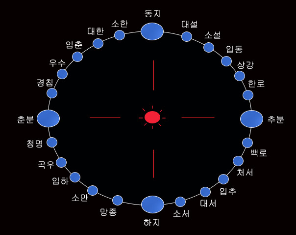 절기(節氣)는 계절의 변화와 농작물을 수확하는 데 정확성을 맞추기 위해 만들어진 것으로 1년은 4계절이 되고 12달이 되며 24절기로 나눈 것인데 특히 24절기는 지구가 태양을 공전하는 시간(약 365.25일)을 24등분하여 만든 태양력이다.